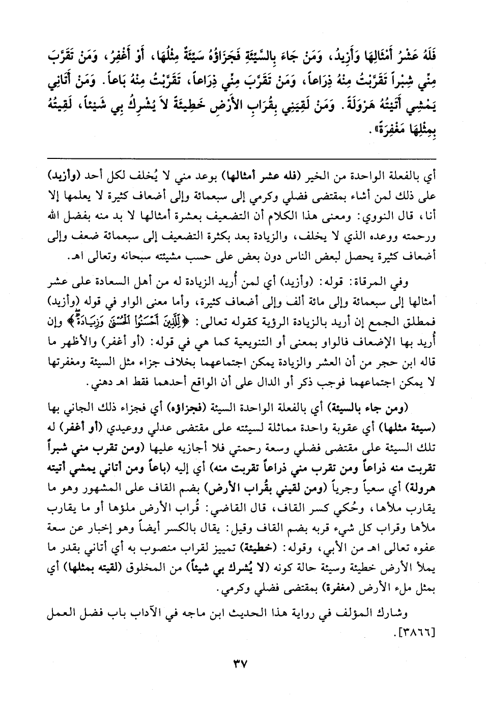 فَلَهُ عَشْرُ أَمْثَالِهَا وَأَزِيدُ، وَمَنْ جَاءَ بِالسَّيِّئَةِ فَجَزَاؤُهُ سَيِّئَةٌ مِثْلُهَا، أَوْ أَغْفِرُ، وَمَنْ تَقَرَّبَ منِّي شِبْرًا تَقَرَّبْتُ مِنْهُ ذِرَاعًا، وَمَنْ تَقَرَّبَ مِنِّي ذِرَاعًا، تَقَرَّبْتُ مِنْهُ بَاعًا. وَمَنْ أَتَانِي يَمْشِي أَتَيْتُهُ هَرْوَلَةً. وَمَنْ لَقِيَنِي بِقُرَابِ الأَرْضِ خَطِيئَة لَا يُشرِكُ بِي شَيئًا، لَقِيْتُهُ بِمِثْلِهَا مَغْفِرَةً"