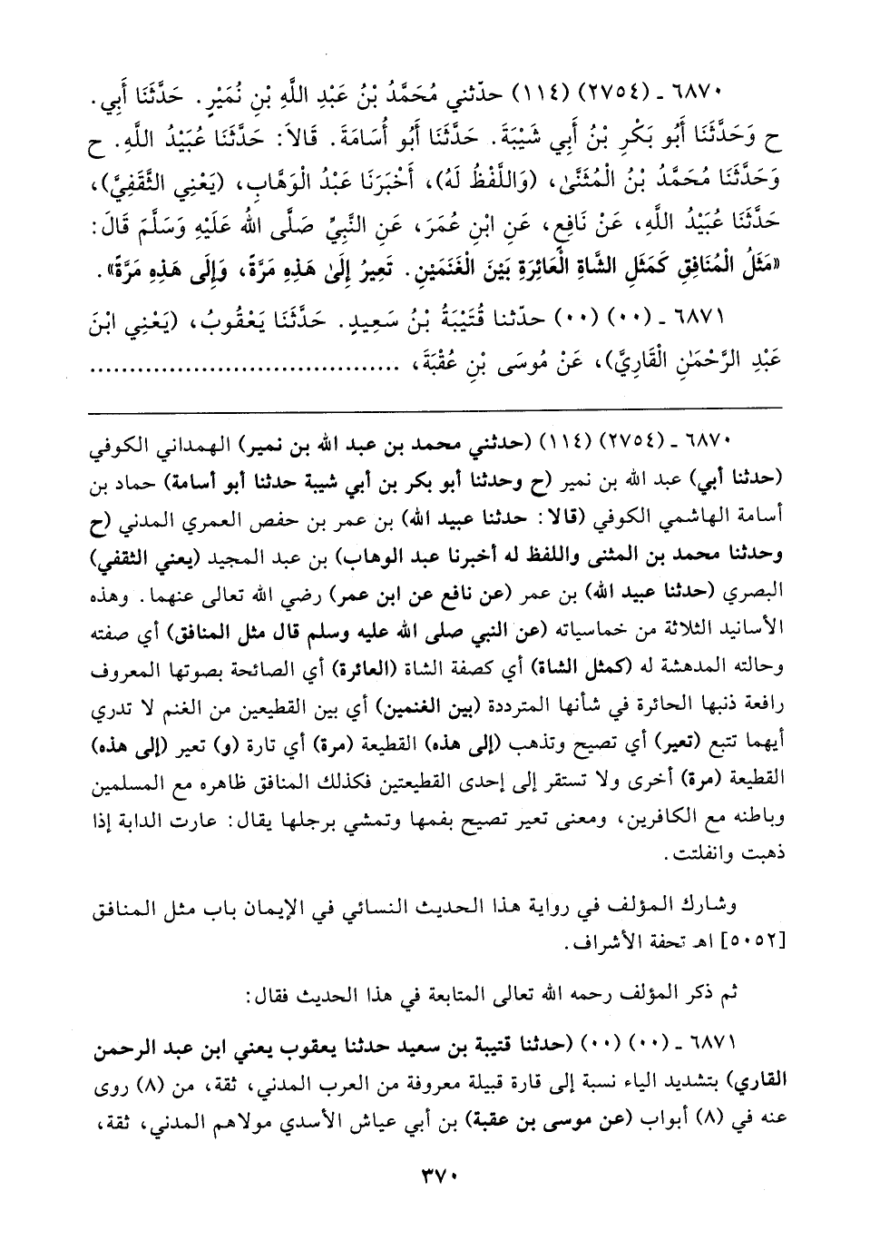 ٦٨٧٠ - (٢٧٥٤) (١١٤) (حدثني محمد بن عبد الله بن نمير) الهمداني الكوفي (حدثنا أبي) عبد الله بن نمير (ح وحدثنا أبو بكر بن أبي شيبة حدثنا أبو أسامة) حماد بن أسامة الهاشمي الكوفي (قالا: حدثنا عبيد الله) بن عمر بن حفص العمري المدني (ح وحدثنا محمد بن المثنى واللفظ له أخبرنا عبد الوهاب) بن عبد المجيد (يعني الثقفي) البصري (حدثنا عبيد الله) بن عمر (عن نافع عن ابن عمر) رضي الله تعالى عنهما. وهذه الأسانيد الثلاثة من خماسياته (عن النبي صلى الله عليه وسلم قال مثل المنافق) أي صفته وحالته المدهشة له (كمثل الشاة) أي كصفة الشاة (العائرة) أي الصائحة بصوتها المعروف رافعة ذنبها الحائرة في شأنها المترددة (بين الغنمين) أي بين القطيعين من الغنم لا تدري أيهما تتبع (تعير) أي تصيح وتذهب (إلى هذه) القطيعة (مرة) أي تارة (و) تعير (إلى هذه) القطيعة (مرة) أخرى ولا تستقر إلى إحدى القطيعتين فكذلك المنافق ظاهره مع المسلمين وباطنه مع الكافرين، ومعنى تعير تصيح بفمها وتمشي برجلها يقال: عارت الدابة إذا ذهبت وانفلتت.