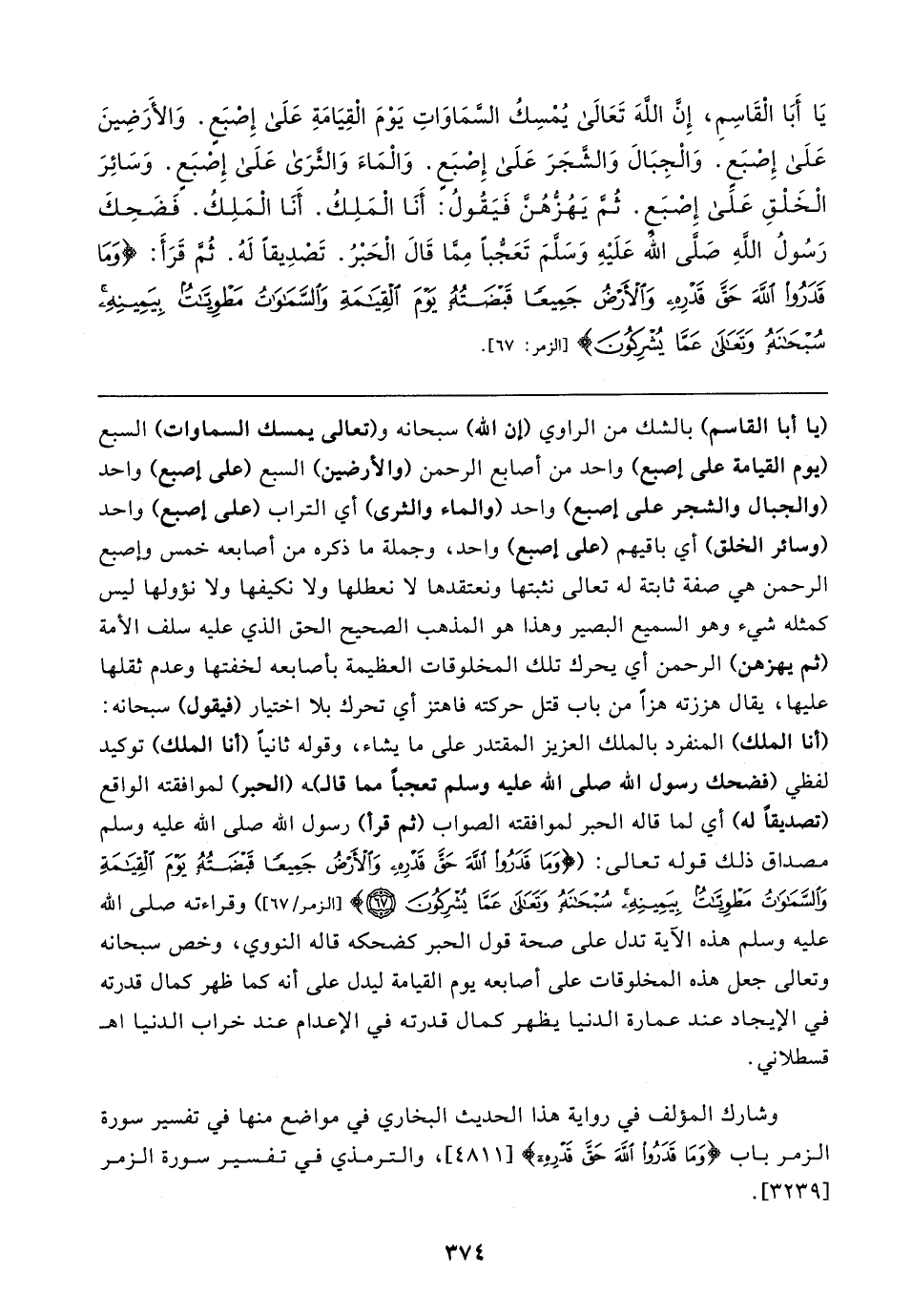 يَا أَبَا الْقَاسِمِ، إِن اللهَ تَعَالَى يُمْسِكُ السَّمَاوَاتِ يَوْمَ الْقِيَامَةِ عَلَى إِصْبَعِ. وَالأَرَضِينَ عَلَى إِصْبَع. وَالْجِبَالَ وَالشجَرَ عَلَى إِصْبَع. وَالْمَاءَ وَالثَّرَى عَلَى إِصْبَع. وَسَائِرَ الْخَلْقِ عَلَى إِصْبَع. ثُمَّ يَهُزُّهُنَّ فَيَقُولُ: أَنَا الْمَلِكُ. أَنَا الْمَلِكُ. فَضَحِكَ رَسُولُ اللَّهِ - صلى الله عليه وسلم - تَعَجُّبًا مِمَّا قَالَ الْحَبْرُ. تَصْدِيقًا لَهُ. ثُمَّ قَرَأَ: {وَمَا قَدَرُوا اللَّهَ حَقَّ قَدْرِهِ وَالْأَرْضُ جَمِيعًا قَبْضَتُهُ يَوْمَ الْقِيَامَةِ وَالسَّمَاوَاتُ مَطْوِيَّاتٌ بِيَمِينِهِ سُبْحَانَهُ وَتَعَالَى عَمَّا يُشْرِكُونَ} [الزمر: ٦٧]