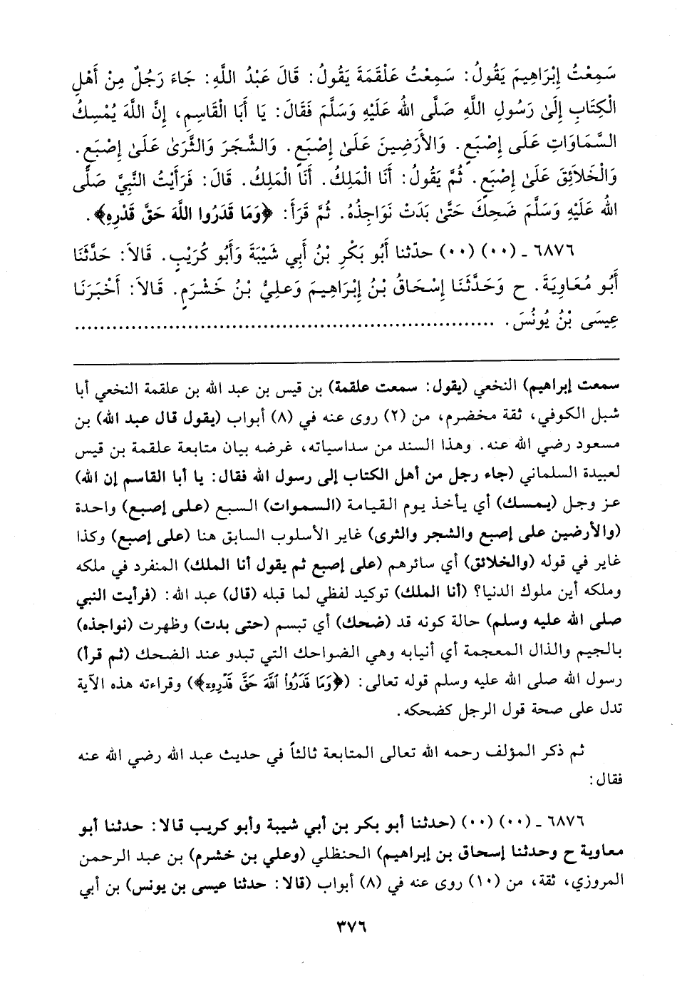 سَمِعْتُ إِبْرَاهِيمَ يَقُولُ: سَمِعْتُ عَلْقَمَةَ يَقُولُ: قَالَ عَبْدُ اللهِ: جَاءَ رَجُلٌ مِنْ أَهْلِ الْكِتَابِ إِلَى رَسُولِ اللَّهِ - صلى الله عليه وسلم - فَقَالَ: يَا أَبَا الْقَاسِمِ، إِن اللهَ يُمْسِكُ السَّمَاوَاتِ عَلَى إِصبَعِ. وَالأَرَضِينَ عَلَى إِصْبَعٍ. وَالشَّجَرَ وَالثَّرَى عَلَى إِصْبَع. وَالْخَلَائِقَ عَلَى إِصبَعِ. ثُمَّ يَقُولُ: أَنَا الْمَلِكُ. أَنَا الْمَلِكُ. قَالَ: فَرَأَيْتُ النَّبِيَّ صَلَّى اللَّهُ عَلَيْهِ وَسَلَّمَ ضَحِكَ حَتَّى بَدَتْ نَوَاجِذُهُ. ثُمَّ قَرَأَ: {وَمَا قَدَرُوا اللَّهَ حَقَّ قَدْرِهِ} ِ.