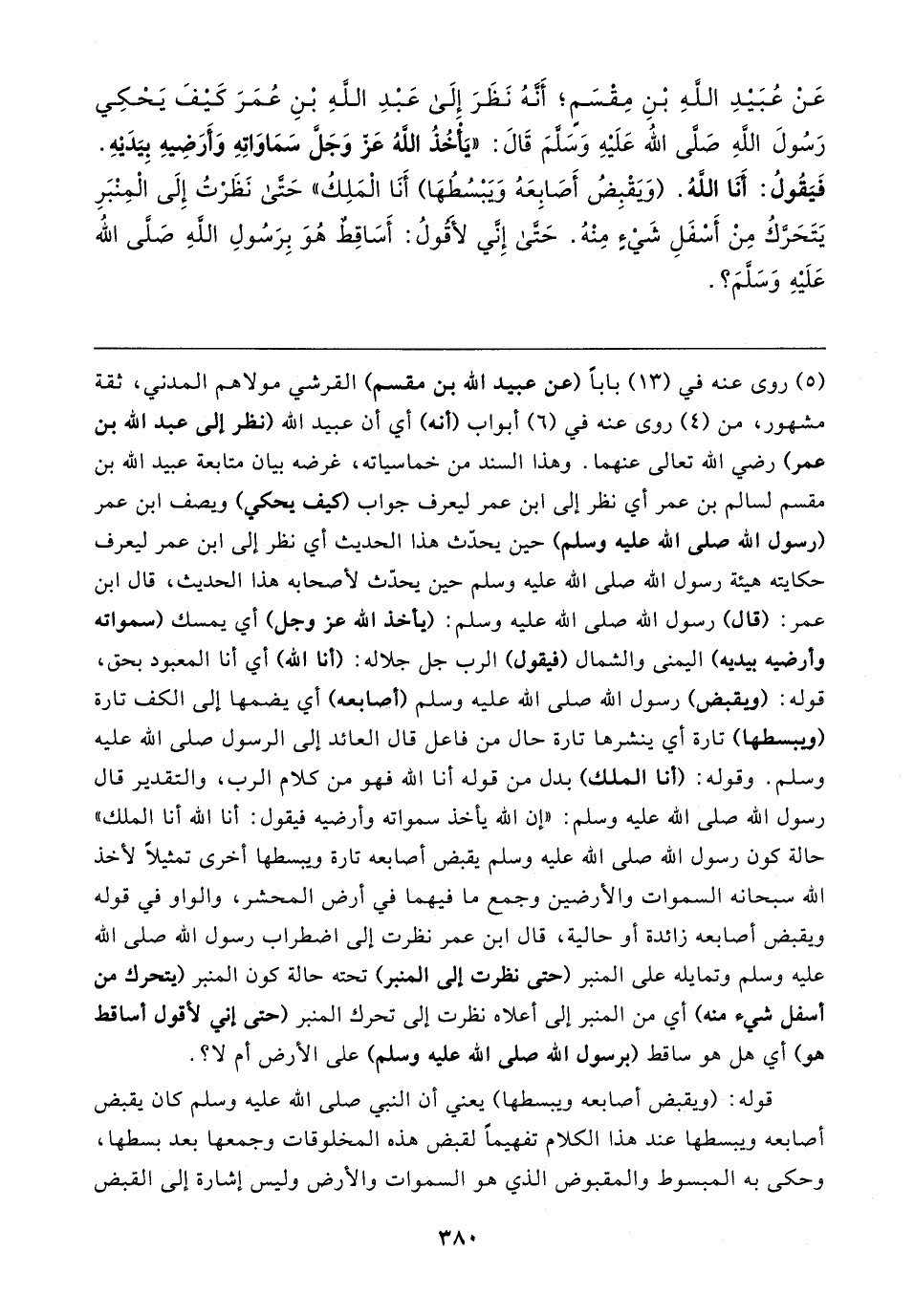 عَنْ عُبَيْدِ اللهِ بْنِ مِقسَمٍ؛ أَنَّهُ نَظَرَ إِلَى عَبْدِ اللهِ بْنِ عُمَرَ كَيفَ يَحْكِي رَسُولَ اللهِ - صلى الله عليه وسلم - قَالَ: لا يَأخُذُ اللهُ عَزّ وَجَلَّ سَمَاوَاتِهِ وَأَرَضِيهِ بِيَدَيْهِ. فَيَقُولُ: أَنا اللهُ. (وَيقْبِضُ أَصَابِعَهُ وَيَبْسُطُهَا) أَنَا الْمَلِكُ" حَتَّى نَظَرْتُ إِلَى الْمِنْبَرِ يَتَحَرَّكُ مِنْ أَسْفَلِ شَيْءٍ مِنْهُ. حَتَّى إِنِّي لأَقولُ: أَسَاقِطٌ هُوَ بِرَسُولِ الله - صلى الله عليه وسلم -؟