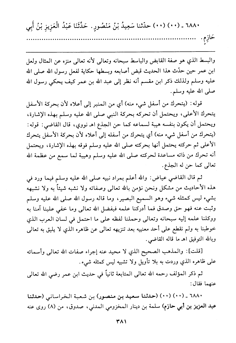 [قلت]: والمذهب الصحيح الذي لا محيد عنه إجراء صفات الله تعالى وأسمائه على ظاهره الذي وردت به بلا تأويل ولا تشبيه ليس كمثله شيء.