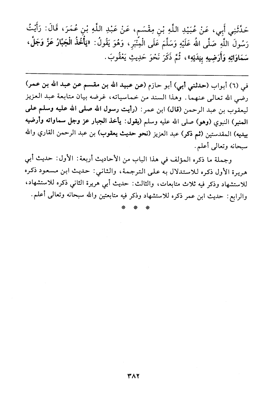 في (٦) أبواب (حدثني أبي) أبو حازم (عن عبيد الله بن مقسم عن عبد الله بن عمر) رضي الله تعالى عنهما. وهذا السند من خماسياته، غرضه بيان متابعة عبد العزيز ليعقوب بن عبد الرحمن (قال) ابن عمر: (رأيت رسول الله صلى الله عليه وسلم على المنبر) النبوي (وهو) صلى الله عليه وسلم (يقول: يأخذ الجبار عز وجل سماواته وأرضيه بيديه) المقدستين (ثم ذكر) عبد العزيز (نحو حديث يعقوب) بن عبد الرحمن القاري والله سبحانه وتعالى أعلم.