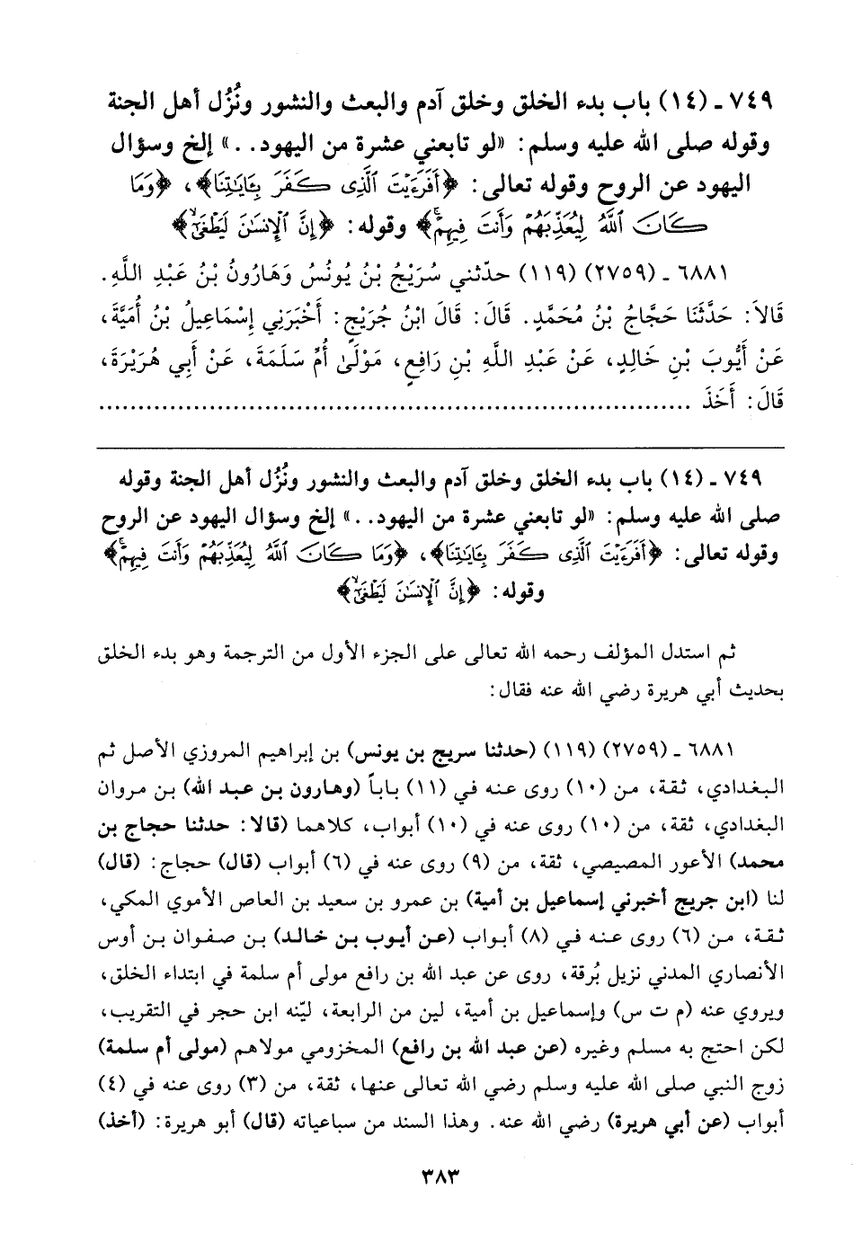 ٧٤٩ - (١٤) باب بدء الخلق وخلق آدم والبعث والنشور ونُزُل أهل الجنة وقوله صلى الله عليه وسلم: "لو تابعني عشرة من اليهود .. " إلخ وسؤال اليهود عن الروح وقوله تعالى: {أَفَرَأَيْتَ الَّذِي كَفَرَ بِآيَاتِنَا}، {وَمَا كَانَ اللَّهُ لِيُعَذِّبَهُمْ وَأَنْتَ فِيهِمْ} وقوله: {إِنَّ الْإِنْسَانَ لَيَطْغَى}