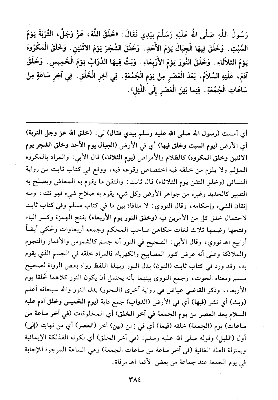 رَسُولُ اللهِ صَلَّى اللَّه عَلَيهِ وَسَلَّمَ بِيَدِي فَقَالَ: "خَلَقَ اللهُ، عَز وَجَلَّ، التُّرْبَةَ يَوْمَ السَّبْتِ. وَخَلَقَ فِيهَا الْجبَالَ يَوْمَ الأَحَدِ. وَخَلَقَ الشَّجَرَ يَوْمَ الاثْنَينِ. وَخَلَقَ الْمَكْرُوهَ يَوْمَ الثلَاثاءِ. وَخَلَقَ النُّورَ يَوْمَ الأَرْبِعَاءِ. وَبَثَّ فِيهَا الدُّوَابَّ يَوْمَ الْخَمِيسِ. وَخَلَقَ آدَمَ، عَلَيهِ السَّلَامُ، بَعْدَ الْعَصْرِ مِنْ يَوْمِ الْجُمُعَةِ. في آخِرِ الْخَلْقِ. في آخِرِ سَاعَةٍ مِنْ سَاعَاتِ الْجُمُعَةِ. فِيَما بَينَ الْعَصْرِ إِلَى اللَّيْلِ"