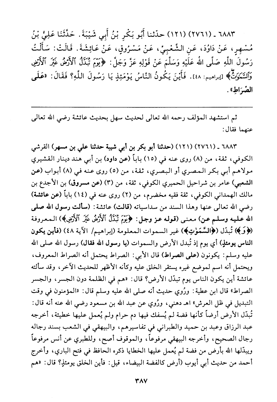 ٦٨٨٣ - (٢٧٦١) (١٢١) (حدثنا أبو بكر بن أبي شيبة حدثنا علي بن مسهر) القرشي الكوفي، ثقة، من (٨) روى عنه في (١٥) بابًا (عن داود) بن أبي هند دينار القشيري مولاهم أبي بكر المصري أو البصري، ثقة، من (٥) روى عنه في (٨) أبواب (عن الشعبي) عامر بن شراحيل الحميري الكوفي، ثقة، من (٣) (عن مسروق) بن الأجدع بن مالك الهمداني الكوفي، ثقة فقيه مخضرم، من (٢) روى عنه في (١٤) بابًا (عن عائشة) رضي الله تعالى عنها وهذا السند من سداسياته (قالت) عائشة: (سألت رسول الله صلى الله عليه وسلم عن) معنى (قوله عز وجل: {يَوْمَ تُبَدَّلُ الْأَرْضُ غَيْرَ الْأَرْضِ} المعروفة ({وَ}) تُبدّل ({وَالسَّمَاوَاتُ}) غير السموات المعلومة (إبراهيم/ الآية ٤٨) (فأين يكون الناس يومئذٍ) أي يوم إذ تُبدل الأرض والسموات (يا رسول الله فقال) رسول الله صلى الله عليه وسلم: يكونون (على الصراط) قال الأبي: الصراط يحتمل أنه الصراط المعروف، ويحتمل أنه اسم لموضع غيره يستقر الخلق عليه وكأنه الأظهر للحديث الآخر، وقد سألته عائشة أين يكون الناس يوم تبدّل الأرض؟ قال: "هم في الظلمة دون الجسر، والجسر الصراط" قال ابن عطية: ورُوي حديث أنه صلى الله عليه وسلم قال: "المؤمنون في وقت التبديل في ظل العرش" اه دهني، ورُوي عن عبد الله بن مسعود رضي الله عنه أنه قال: تُبدّل الأرض أرضًا كأنها فضة لم يُسفك فيها دم حرام ولم يُعمل عليها خطيئة، أخرجه عبد الرزاق وعبد بن حميد والطبراني في تفاسيرهم، والبيهقي في الشعب بسند رجاله رجال الصحيح، وأخرجه البيهقي مرفوعًا، والموقوف أصح، وللطبري عن أنس مرفوعًا ويبدّلها الله بأرض من فضة لم يُعمل عليها الخطايا ذكره الحافظ في فتح الباري، وأخرج أحمد من حديث أبي أيوب (أرض كالفضة البيضاء، قيل: فأين الخلق يومئذٍ؟ قال: "هم