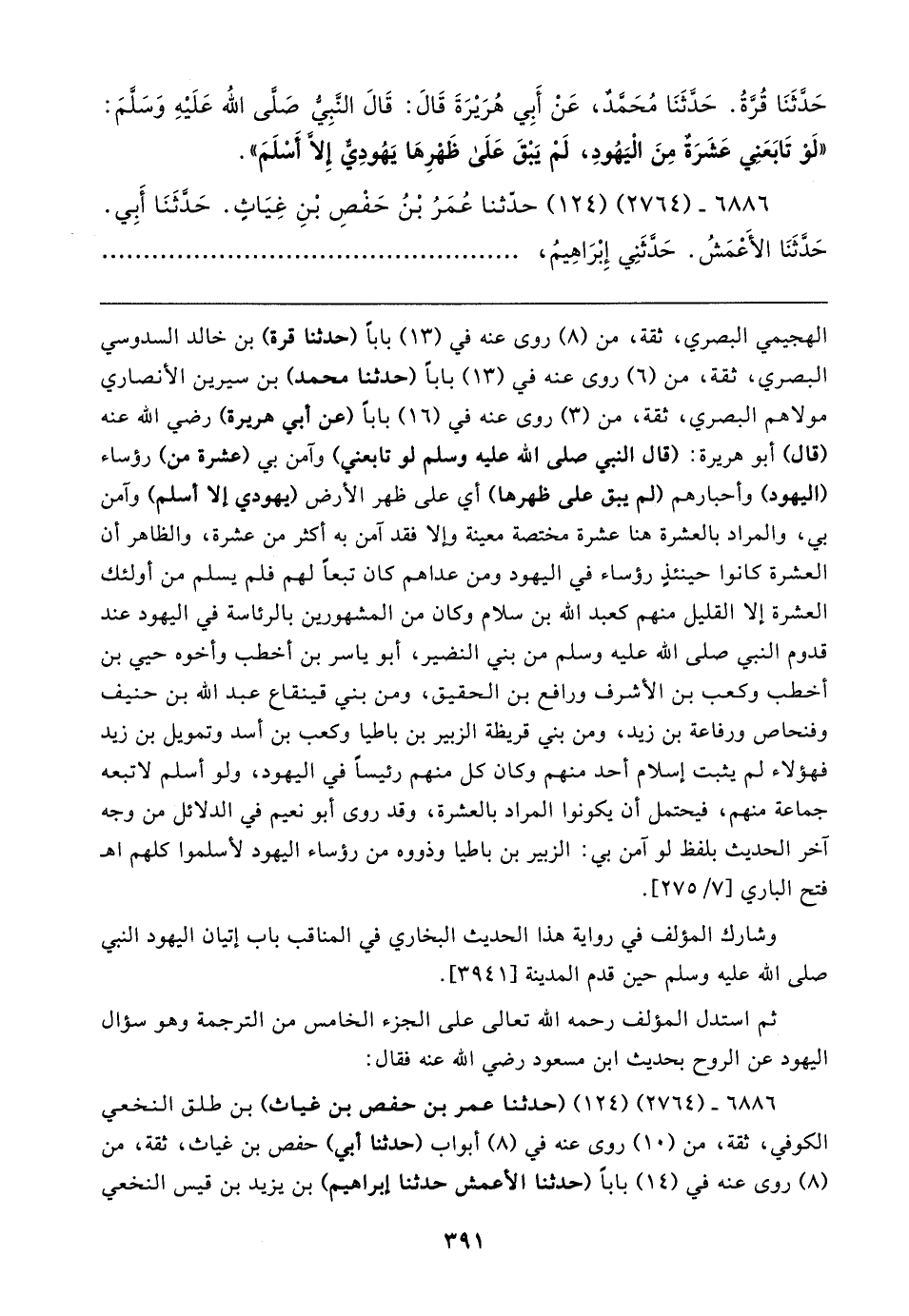الهجيمي البصري، ثقة، من (٨) روى عنه في (١٣) بابًا (حدثنا قرة) بن خالد السدوسي البصري، ثقة، من (٦) روى عنه في (١٣) بابًا (حدثنا محمد) بن سيرين الأنصاري مولاهم البصري، ثقة، من (٣) روى عنه في (١٦) بابًا (عن أبي هريرة) رضي الله عنه (قال) أبو هريرة: (قال النبي صلى الله عليه وسلم لو تابعني) وآمن بي (عشرة من) رؤساء (اليهود) وأحبارهم (لم يبق على ظهرها) أي على ظهر الأرض (يهودي إلا أسلم) وآمن بي، والمراد بالعشرة هنا عشرة مختصة معينة وإلا فقد آمن به أكثر من عشرة، والظاهر أن العشرة كانوا حينئذٍ رؤساء في اليهود ومن عداهم كان تبعًا لهم فلم يسلم من أولئك العشرة إلا القليل منهم كعبد الله بن سلام وكان من المشهورين بالرئاسة في اليهود عند قدوم النبي صلى الله عليه وسلم من بني النضير، أبو ياسر بن أخطب وأخوه حيي بن أخطب وكعب بن الأشرف ورافع بن الحقيق، ومن بني قينقاع عبد الله بن حنيف وفنحاص ورفاعة بن زيد، ومن بني قريظة الزبير بن باطيا وكعب بن أسد وتمويل بن زيد فهؤلاء لم يثبت إسلام أحد منهم وكان كل منهم رئيسًا في اليهود، ولو أسلم لاتبعه جماعة منهم، فيحتمل أن يكونوا المراد بالعشرة، وقد روى أبو نعيم في الدلائل من وجه آخر الحديث بلفظ لو آمن بي: الزبير بن باطيا وذووه من رؤساء اليهود لأسلموا كلهم اه فتح الباري [٧/ ٢٧٥].