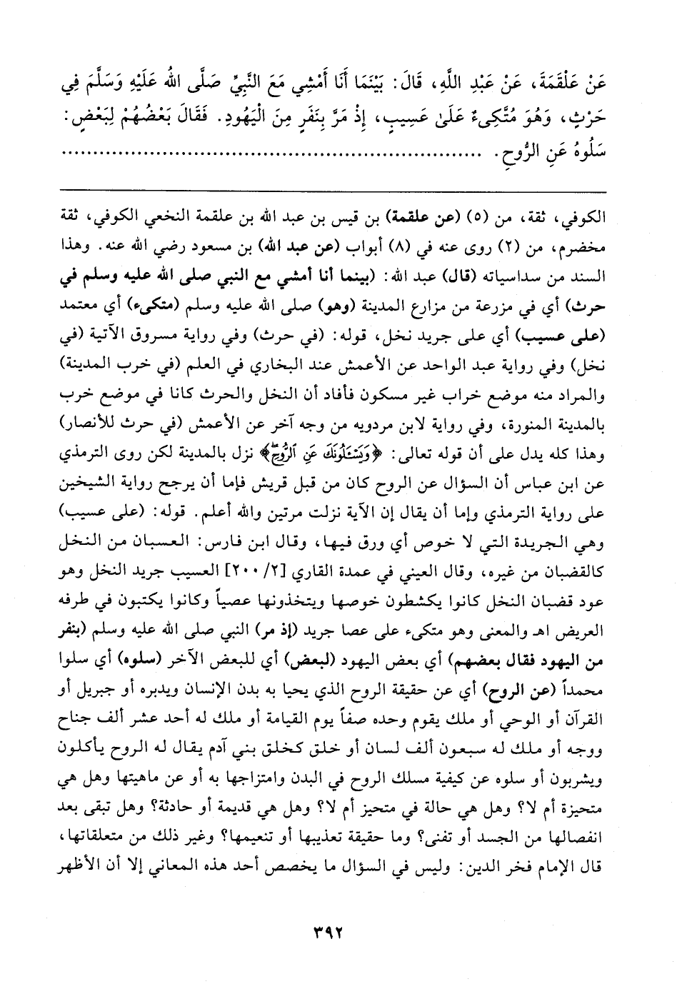 عَنْ عَلْقَمَةَ، عَنْ عَبْدِ اللهِ، قَالَ: بَيْنَمَا أَنا أَمْشِي مَعَ النَّبِىِّ صَلَّى اللَّه عَلَيْهِ وَسَلَّمَ في حَرْثٍ، وَهُوَ مُتَّكِئٌ عَلَى عَسِيبٍ، إِذْ مَرَّ بِنَفَرٍ مِنَ الْيَهُودِ. فَقَالَ بَعْضهُمْ لِبَعْضٍ: سَلُوهُ عَنِ الرُّوحِ