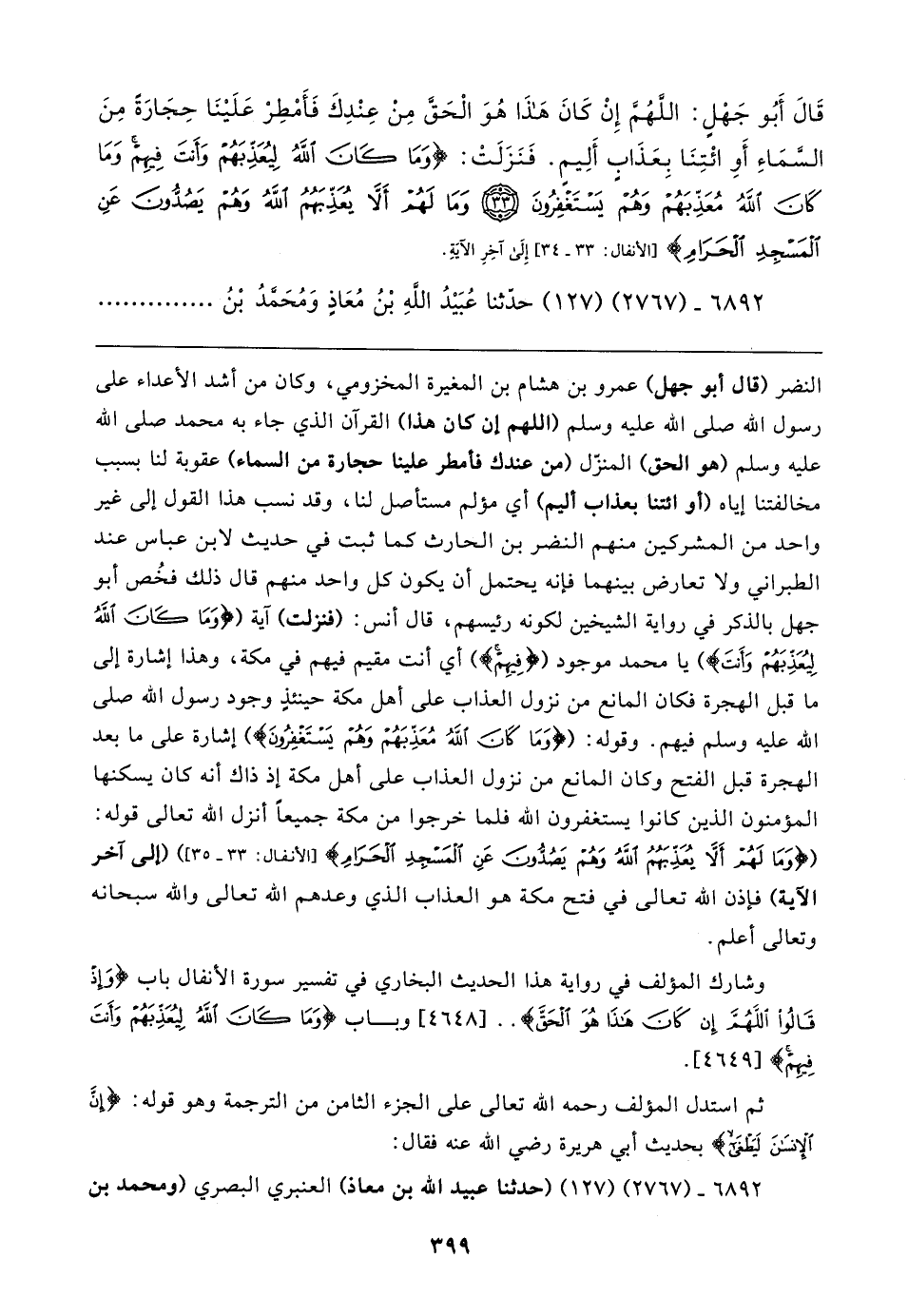 النضر (قال أبو جهل) عمرو بن هشام بن المغيرة المخزومي، وكان من أشد الأعداء على رسول الله صلى الله عليه وسلم (اللهم إن كان هذا) القرآن الذي جاء به محمد صلى الله عليه وسلم (هو الحق) المنزّل (من عندك فأمطر علينا حجارة من السماء) عقوبة لنا بسبب مخالفتنا إياه (أو ائتنا بعذاب أليم) أي مؤلم مستأصل لنا، وقد نسب هذا القول إلى غير واحد من المشركين منهم النضر بن الحارث كما ثبت في حديث لابن عباس عند الطبراني ولا تعارض بينهما فإنه يحتمل أن يكون كل واحد منهم قال ذلك فخُص أبو جهل بالذكر في رواية الشيخين لكونه رئيسهم، قال أنس: (فنزلت) آية ({وَمَا كَانَ اللَّهُ لِيُعَذِّبَهُمْ وَأَنْتَ}) يا محمد موجود ({فِيهِمْ}) أي أنت مقيم فيهم في مكة، وهذا إشارة إلى ما قبل الهجرة فكان المانع من نزول العذاب على أهل مكة حينئذٍ وجود رسول الله صلى الله عليه وسلم فيهم. وقوله: ({وَمَا كَانَ اللَّهُ مُعَذِّبَهُمْ وَهُمْ يَسْتَغْفِرُونَ}) إشارة على ما بعد الهجرة قبل الفتح وكان المانع من نزول العذاب على أهل مكة إذ ذاك أنه كان يسكنها المؤمنون الذين كانوا يستغفرون الله فلما خرجوا من مكة جميعًا أنزل الله تعالى قوله: {وَمَا لَهُمْ أَلَّا يُعَذِّبَهُمُ اللَّهُ وَهُمْ يَصُدُّونَ عَنِ الْمَسْجِدِ الْحَرَامِ} [الأنفال: ٣٤] (إلى آخر الآية) فإذن الله تعالى في فتح مكة هو العذاب الذي وعدهم الله تعالى والله سبحانه وتعالى أعلم.