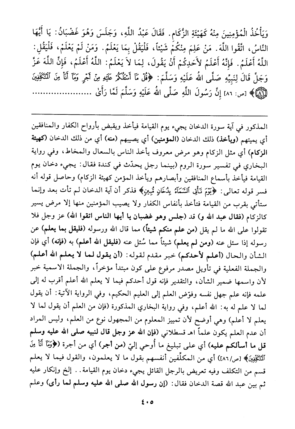 المذكور في آية سورة الدخان يجيء يوم القيامة فيأخذ ويقبض بأرواح الكفار والمنافقين أي يميتهم (ويأخذ) ذلك الدخان (المؤمنين) أي يصيبهم (منه) أي من ذلك الدخان (كهيئة الزكام) أي مثل الزكام وهو مرض معروف يأخذ الناس بالسعال والمخاط، وفي رواية البخاري في تفسير سورة الروم (بينما رجل يحدّث في كندة فقال: يجيء دخان يوم القيامة فيأخذ بأسماع المنافقين وأبصارهم ويأخذ المؤمن كهيئة الزكام) وحاصل قوله أنه فسر قوله تعالى: {يَوْمَ تَأْتِي السَّمَاءُ بِدُخَانٍ} فذكر أن آية الدخان لم تأت بعد وإنما ستأتي بقرب من القيامة فتأخذ بأنفاس الكفار ولا يصيب المؤمنين منها إلا مرض يسير كالزكام (فقال عبد الله و) قد (جلس وهو غضبان يا أيها الناس اتقوا الله) عز وجل فلا تقولوا على الله ما لم يقل (من علم منكم شيئًا) مما قال الله ورسوله (فليقل بما يعلم) عن رسوله إذا سئل عنه (ومن لم يعلم) شيئًا مما سُئل عنه (فليقل الله أعلم) به (فإنه) أي فإن الشأن والحال (أعلم لأحدكم) خبر مقدم لقوله: (أن يقول لما لا يعلم الله أعلم) والجملة الفعلية في تأويل مصدر مرفوع على كون مبتدأ مؤخرًا، والجملة الاسمية خبر لأن واسمها ضمير الشأن، والتقدير فإنه قول أحدكم فيما لا يعلم الله أعلم أقرب له إلى علمه فإنه علم جهل نفسه وفوّض العلم إلى العليم الحكيم، وفي الرواية الآتية: أن يقول لما لا علم له به: الله أعلم، وفي رواية البخاري المذكورة (فإن من العلم أن يقول لما لا يعلم لا أعلم) وهي أوضح لأن تمييز المعلوم من المجهول نوع من العلم، وليس المراد أن عدم العلم يكون علمًا اهـ قسطلاني (فإن الله عز وجل قال لنبيه صلى الله عليه وسلم قل ما أسألكم عليه) أي على تبليغ ما أُوحي إليّ (من أجر) أي من أجرة ({وَمَا أَنَا مِنَ الْمُتَكَلِّفِينَ} [ص: ٨٦]) أي من المكلِّفين أنفسهم بقول ما لا يعلمون، والقول فيما لا يعلم قسم من التكلف وفيه تعريض بالرجل القائل يجيء دخان يوم القيامة .. إلخ وإنكار عليه ثم بين عبد الله قصة الدخان فقال: (إن رسول الله صلى الله عليه وسلم لما رأى) وعلم