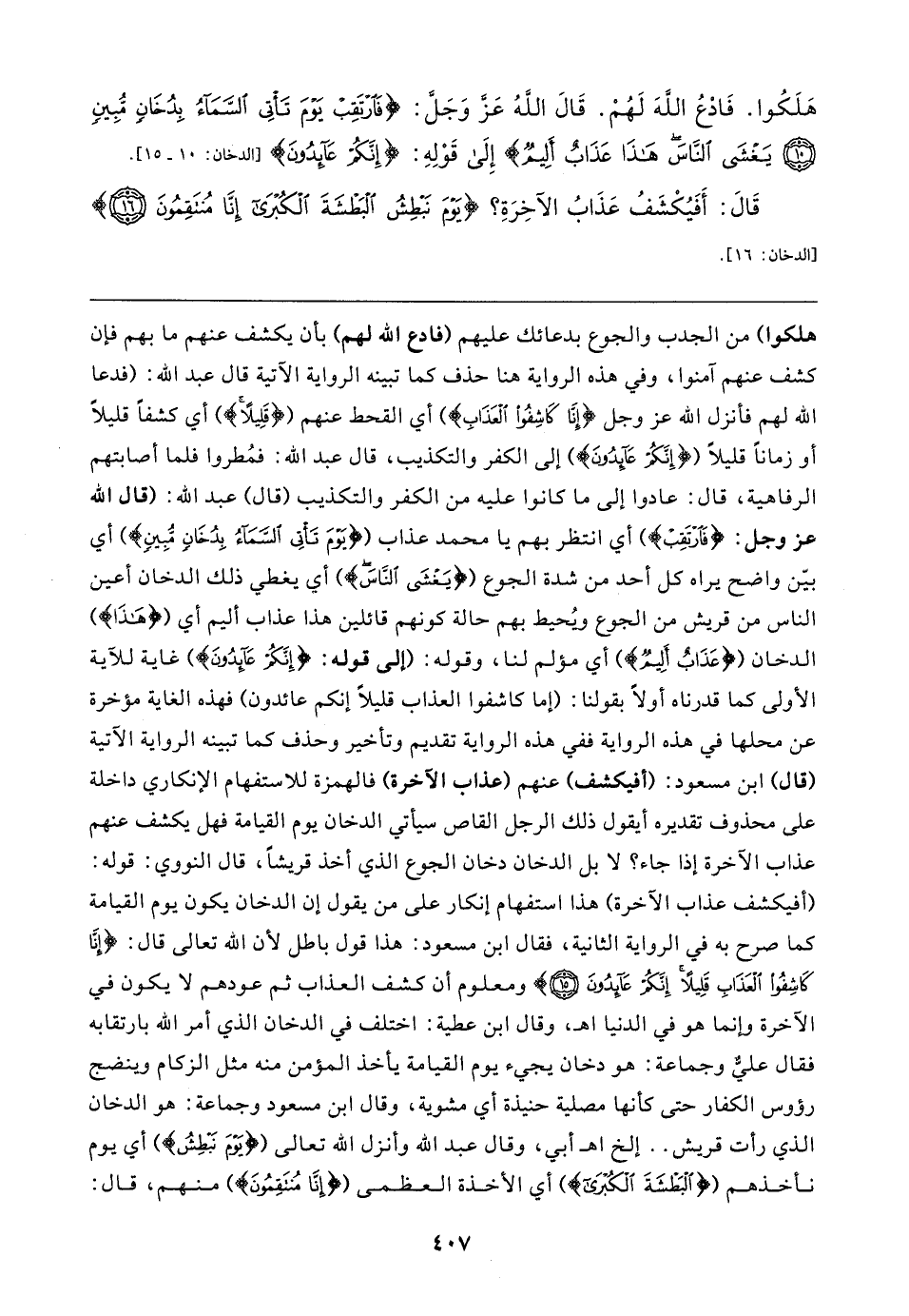 هلكوا) من الجدب والجوع بدعائك عليهم (فادع الله لهم) بأن يكشف عنهم ما بهم فإن كشف عنهم آمنوا، وفي هذه الرواية هنا حذف كما تبينه الرواية الآتية قال عبد الله: (فدعا الله لهم فأنزل الله عز وجل {إِنَّا كَاشِفُو الْعَذَابِ}) أي القحط عنهم ({قَلِيلًا}) أي كشفًا قليلًا أو زمانًا قليلًا ({إِنَّكُمْ عَائِدُونَ}) إلى الكفر والتكذيب، قال عبد الله: فمُطروا فلما أصابتهم الرفاهية، قال: عادوا إلى ما كانوا عليه من الكفر والتكذيب (قال) عبد الله: (قال الله عز وجل: {فَارْتَقِبْ}) أي انتظر بهم يا محمد عذاب ({يَوْمَ تَأْتِي السَّمَاءُ بِدُخَانٍ مُبِينٍ}) أي بيّن واضح يراه كل أحد من شدة الجوع ({يَغْشَى النَّاسَ}) أي يغطي ذلك الدخان أعين الناس من قريش من الجوع ويُحيط بهم حالة كونهم قائلين هذا عذاب أليم أي ({هَذَا}) الدخان ({عَذَابٌ أَلِيمٌ}) أي مؤلم لنا، وقوله: (إلى قوله: {إِنَّكُمْ عَائِدُونَ}) غاية للآية الأولى كما قدرناه أولًا بقولنا: (إما كاشفوا العذاب قليلًا إنكم عائدون) فهذه الغاية مؤخرة عن محلها في هذه الرواية ففي هذه الرواية تقديم وتأخير وحذف كما تبينه الرواية الآتية (قال) ابن مسعود: (أفيكشف) عنهم (عذاب الآخرة) فالهمزة للاستفهام الإنكاري داخلة على محذوف تقديره أيقول ذلك الرجل القاص سيأتي الدخان يوم القيامة فهل يكشف عنهم عذاب الآخرة إذا جاء؛ لا بل الدخان دخان الجوع الذي أخذ قريشًا، قال النووي: قوله: (أفيكشف عذاب الآخرة) هذا استفهام إنكار على من يقول إن الدخان يكون يوم القيامة كما صرح به في الرواية الثانية، فقال ابن مسعود: هذا قول باطل لأن الله تعالى قال: {إِنَّا كَاشِفُو الْعَذَابِ قَلِيلًا إِنَّكُمْ عَائِدُونَ (١٥)} ومعلوم أن كشف العذاب ثم عودهم لا يكون في الآخرة وإنما هو في الدنيا اه، وقال ابن عطية: اختلف في الدخان الذي أمر الله بارتقابه فقال عليٌّ وجماعة: هو دخان يجيء يوم القيامة يأخذ المؤمن منه مثل الزكام وينضج رؤوس الكفار حتى كأنها مصلية حنيذة أي مشوية، وقال ابن مسعود وجماعة: هو الدخان الذي رأت قريش .. إلخ اه أبي، وقال عبد الله وأنزل الله تعالى ({يَوْمَ نَبْطِشُ}) أي يوم نأخذهم ({الْبَطْشَةَ الْكُبْرَى}) أي الأخذة العظمى ({إِنَّا مُنْتَقِمُونَ}) منهم، قال:
