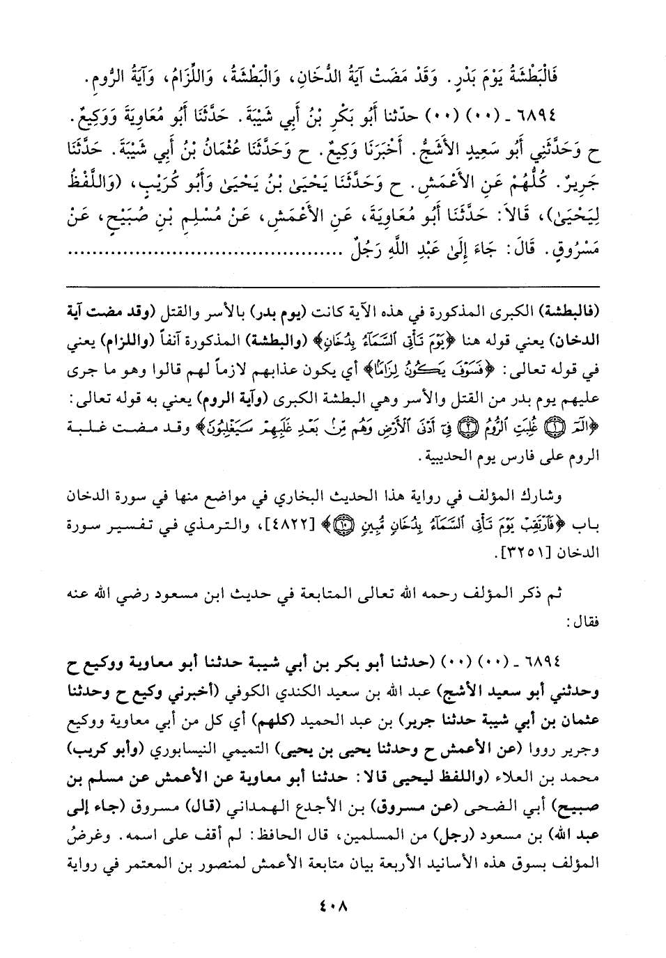 ٦٨٩٤ (٠٠) (٠٠) حدّثنا أَبُو بَكْرِ بْنُ أَبِي شَيْبَةَ. حَدَّثَنَا أَبُو مُعَاوِيةَ وَوَكِيعٌ. ح وَحَدَّثَنِي أَبُو سَعِيدٍ الأَشَجُّ. أَخْبَرَنَا وَكِيعٌ. ح وَحَدَّثَنَا عُثْمَانُ بْنُ أَبِي شَيْبَةَ. حَدَّثَنَا جَرِيرٌ. كُلُّهُمْ عَنِ الأعمَشِ. ح وَحَدَّثَنَا يَحْيَى بْنُ يَحْيَى وَأَبُو كُرَيْبٍ، (وَاللَّفْظُ لِيَحْيَى)، قَالَا: حَدَّثَنَا أَبُو مُعَاوَيةَ، عَنِ الأعمَشِ، عَنْ مُسْلِمِ بْنِ صُبَيْحٍ، عَنْ مَسْرُوقٍ. قَالَ: جَاءَ إِلَى عَبْدِ اللهِ رَجُل