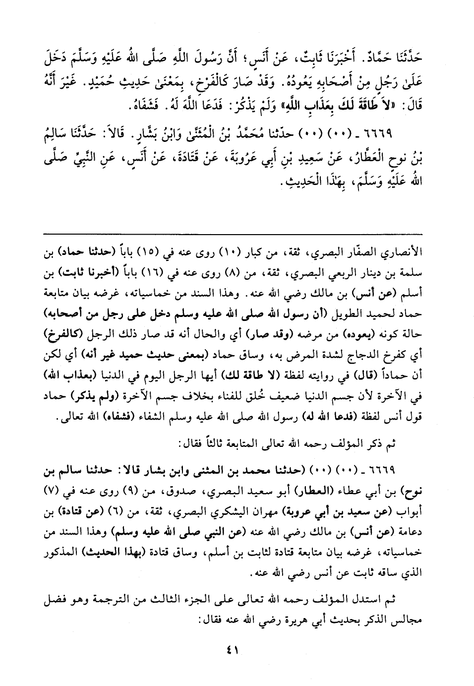 ٦٦٦٩ - (٠) (٠٠) (حَدَّثَنَا محمد بن المثنى وابن بشار قالا: حَدَّثَنَا سالم بن نوح) بن أبي عطاء (العطار) أبو سعيد البصري، صدوق، من (٩) روى عنه في (٧) أبواب (عن سعيد بن أبي عروبة) مهران اليشكري البصري، ثقة، من (٦) (عن قتادة) بن دعامة (عن أنى) بن مالك رضي الله عنه (عن النبي صلى الله عليه وسلم) وهذا السند من خماسياته، غرضه بيان متابعة قتادة لثابت بن أسلم، وساق قتادة (بهذا الحديث) المذكور الَّذي ساقه ثابت عن أنس رضي الله عنه.