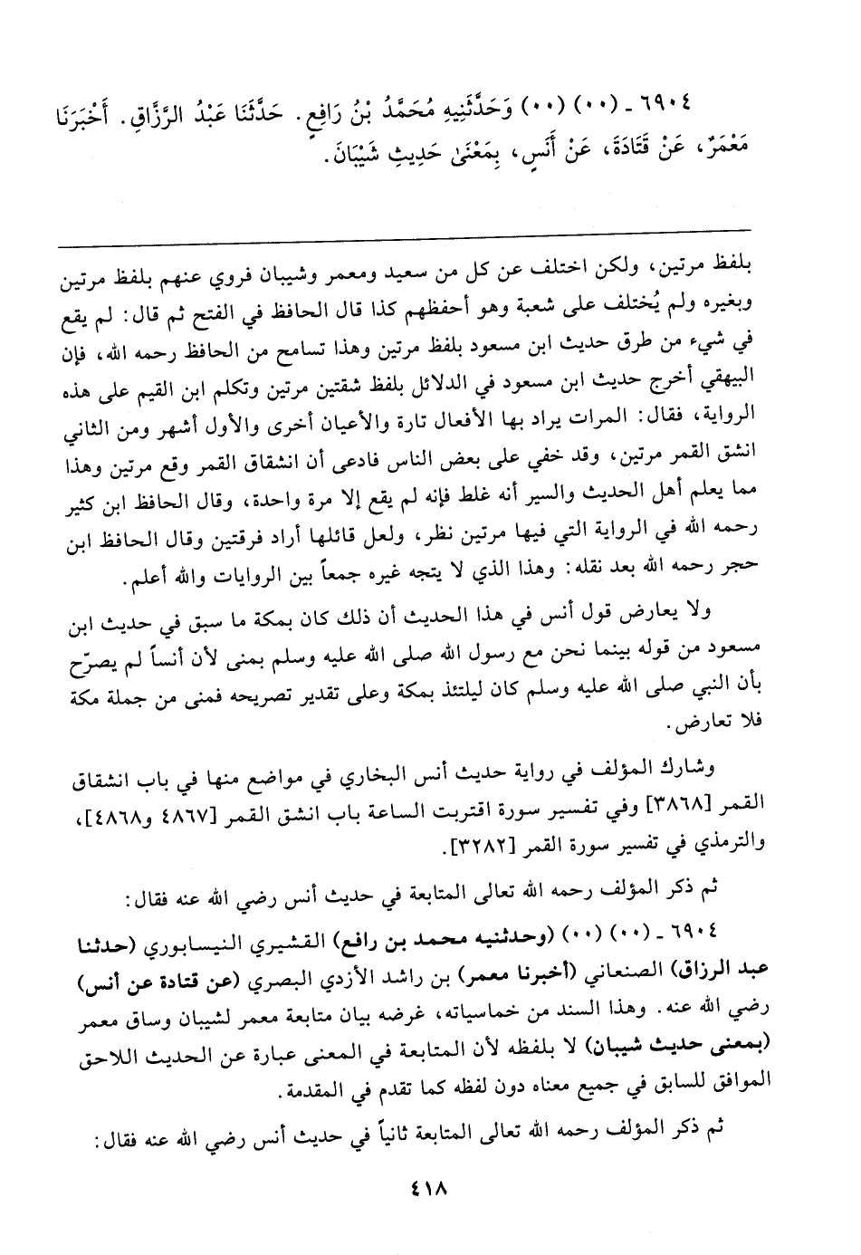 ٦٩٠٤ - (٠٠) (٠٠) (وحدثنيه محمد بن رافع) القشيري النيسابوري (حدثنا عبد الرزاق) الصنعاني (أخبرنا معمر) بن راشد الأزدي البصري (عن قتادة عن أنس) رضي الله عنه. وهذا السند من خماسياته، غرضه بيان متابعة معمر لشيبان وساق معمر (بمعنى حديث شيبان) لا بلفظه لأن المتابعة في المعنى عبارة عن الحديث اللاحق الموافق للسابق في جميع معناه دون لفظه كما تقدم في المقدمة.