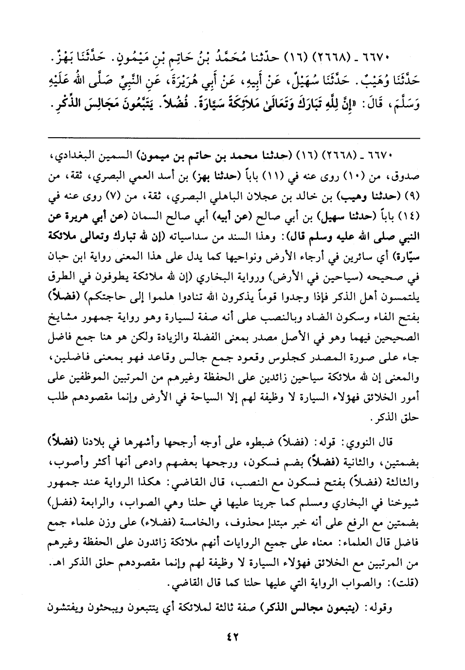 ٦٦٧٠ - (٢٦٦٨) (١٦) (حَدَّثَنَا محمد بن حاتم بن ميمون) السمين البغدادي، صدوق، من (١٠) روى عنه في (١١) بابًا (حَدَّثَنَا بهز) بن أسد العمي البصري، ثقة، من (٩) (حَدَّثَنَا وهيب) بن خالد بن عجلان الباهلي البصري، ثقة، من (٧) روى عنه في (١٤) بابًا (حَدَّثَنَا سهيل) بن أبي صالح (عن أبيه) أبي صالح السمان (عن أبي هريرة عن النبي صلى الله عليه وسلم قال): وهذا السند من سداسياته (أن لله تبارك وتعالى ملائكة سيّارة) أي سائرين في أرجاء الأرض ونواحيها كما يدل على هذا المعنى رواية ابن حبان في صحيحه (سياحين في الأرض) ورواية البخاري (إن لله ملائكة يطوفون في الطرق يلتمسون أهل الذكر فإذا وجدوا قومًا يذكرون الله تنادوا هلموا إلى حاجتكم) (فضلًا) بفتح الفاء وسكون الضاد وبالنصب على أنَّه صفة لسيارة وهو رواية جمهور مشايخ الصحيحين فيهما وهو في الأصل مصدر بمعنى الفضلة والزيادة ولكن هو هنا جمع فاضل جاء على صورة المصدر كجلوس وقعود جمع جالس وقاعد فهو بمعنى فاضلين، والمعنى إن لله ملائكة سياحين زائدين على الحفظة وغيرهم من المرتبين الموظفين على أمور الخلائق فهؤلاء السيارة لا وظيفة لهم إلَّا السياحة في الأرض وإنما مقصودهم طلب حلق الذكر.