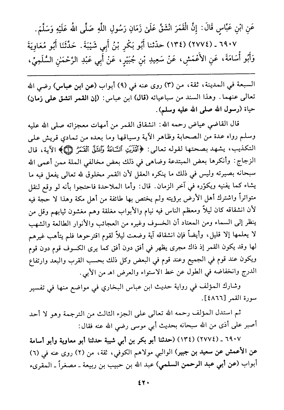 السبعة في المدينة، ثقة، من (٣) روى عنه في (٩) أبواب (عن ابن عباس) رضي الله تعالى عنهما. وهذا السند من سباعياته (قال) ابن عباس: (أن القمر انشق على زمان) حياة (رسول الله صلى الله عليه وسلم).