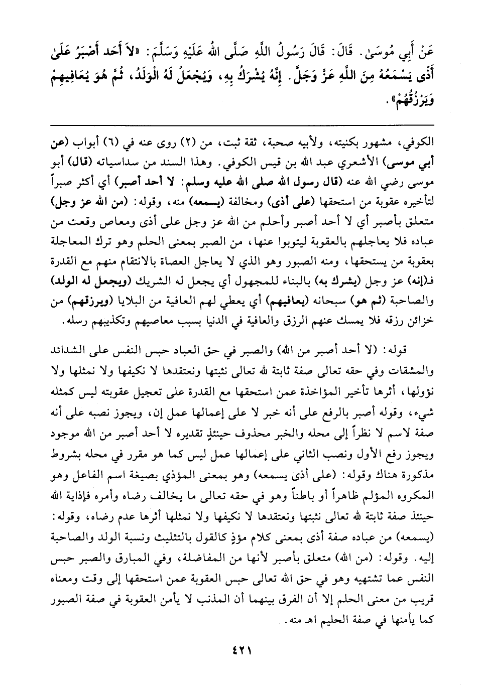 الكوفي، مشهور بكنيته، ولأبيه صحبة، ثقة ثبت، من (٢) روى عنه في (٦) أبواب (عن أبي موسى) الأشعري عبد الله بن قيس الكوفي. وهذا السند من سداسياته (قال) أبو موسى رضي الله عنه (قال رسول الله صلى الله عليه وسلم: لا أحد أصبر) أي أكثر صبرًا لتأخيره عقوبة من استحقها (على أذى) ومخالفة (يسمعه) منه، وقوله: (من الله عز وجل) متعلق بأصبر أي لا أحد أصبر وأحلم من الله عز وجل على أذى ومعاص وقعت من عباده فلا يعاجلهم بالعقوبة ليتوبوا عنها، من الصبر بمعنى الحلم وهو ترك المعاجلة بعقوبة من يستحقها، ومنه الصبور وهو الذي لا يعاجل العصاة بالانتقام منهم مع القدرة فـ (إنه) عز وجل (يشرك به) بالبناء للمجهول أي يجعل له الشريك (ويجعل له الولد) والصاحبة (ثم هو) سبحانه (يعافيهم) أي يعطي لهم العافية من البلايا (ويرزقهم) من خزائن رزقه فلا يمسك عنهم الرزق والعافية في الدنيا بسبب معاصيهم وتكذيبهم رسله.