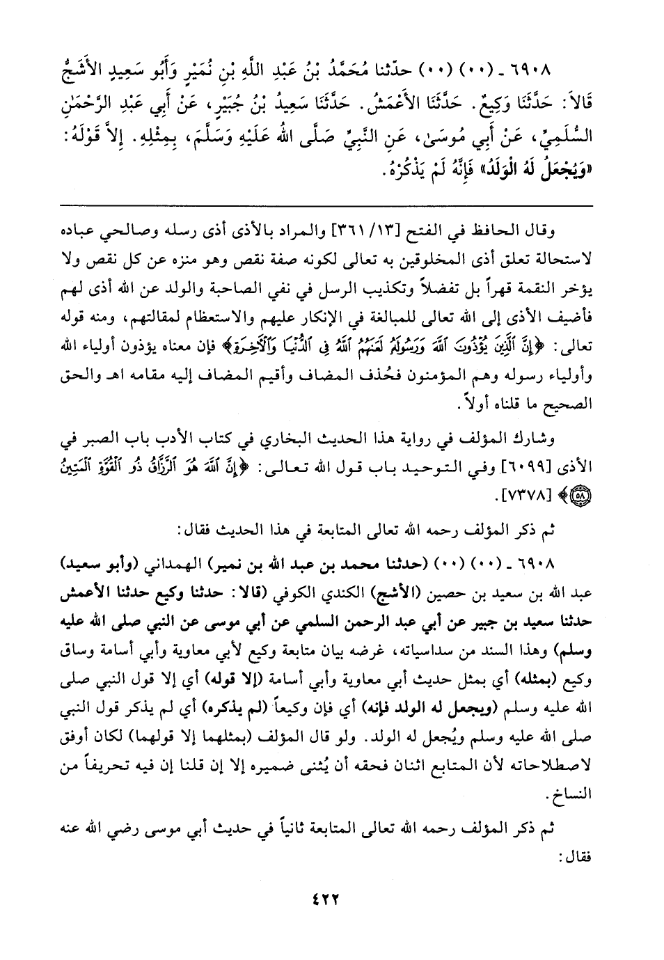 ٦٩٥٨ - (٠٠) (٠٠) (حدّثنا مُحَمَّدُ بْنُ عَبْدِ اللهِ بْنِ نُمَيْرٍ وَأَبُو سَعِيدِ الأَشَجُّ قَالَا: حَدَّثَنَا وَكِيعٌ. حَدَّثَنَا الأَعْمَشُ. حَدَّثَنَا سَعِيدُ بْنُ جُبَيْرٍ، عَنْ أَبِي عَبْدِ الرَّحْمَنِ السُّلَمِيِّ، عَنْ أَبِي مُوسَى، عَنِ النَّبِيِّ - صلى الله عليه وسلم -، بِمِثْلِهِ. إِلَّا قَوْلَهُ: "وَيُجْعَلُ لَهُ الْوَلَدُ" فَإِنَّهُ لَمْ يَذْكُرْهُ