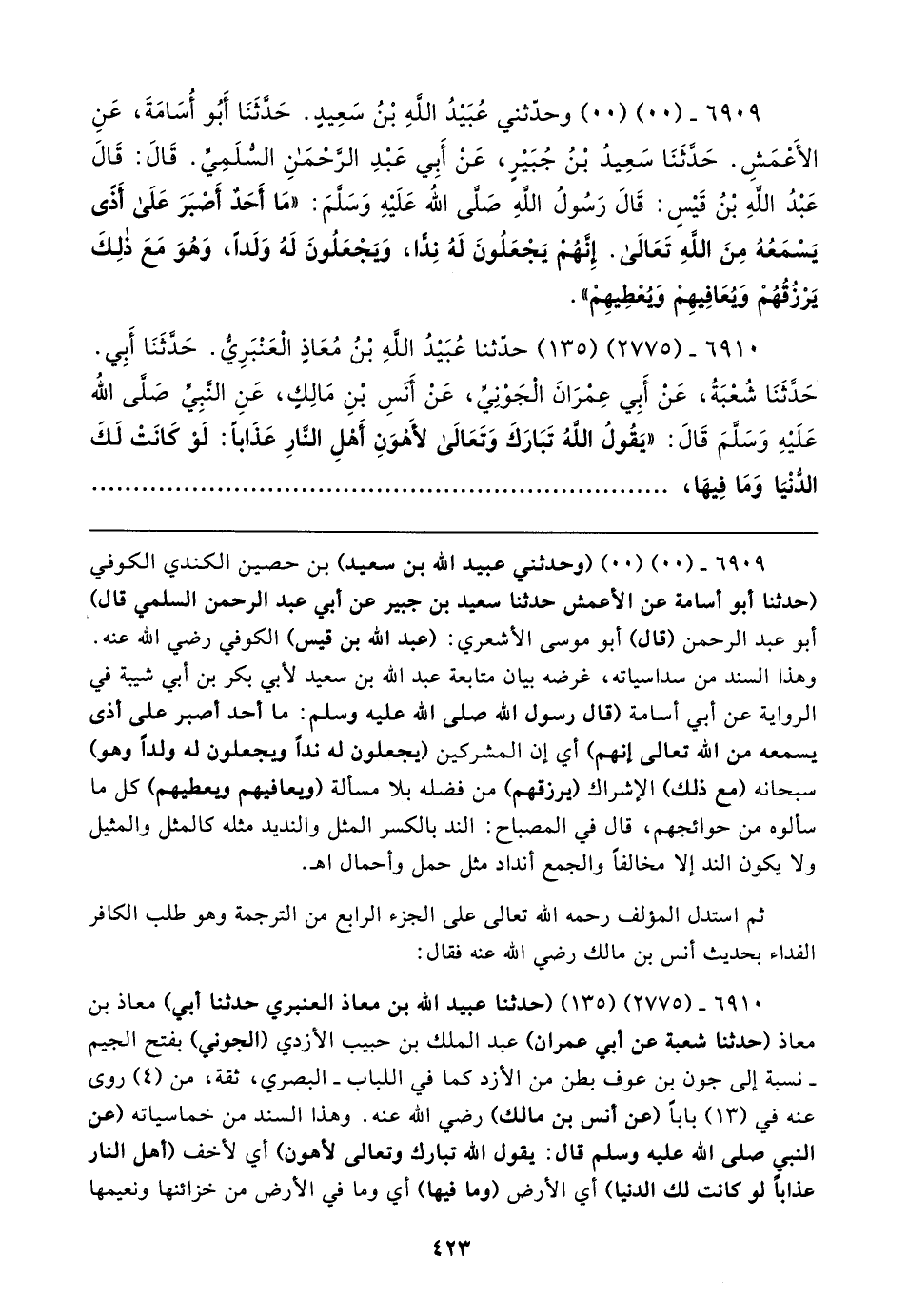 ٦٩٠٩ - (٠٠) (٠٠) وحدّثني عُبَيْدُ اللهِ بْنُ سَعِيدٍ. حَدَّثَنَا أَبُو أُسَامَةَ، عَنِ الأعمَشِ. حَدَّثنَا سَعِيدُ بْنُ جُبَيْرٍ، عَنْ أَبِي عَبْدِ الرَّحْمَنِ السُّلَمِيِّ. قَالَ: قَالَ عَبْدُ اللهِ بْنُ قَيْسٍ: قَالَ رَسُولُ اللهِ - صلى الله عليه وسلم -: "مَا أَحَدٌ أَصْبَرَ عَلَى أَذًى يَسْمَعُهُ مِنَ اللهِ تَعَالَى. إِنَّهُمْ يَجْعَلُونَ لَهُ نِدًّا، وَيَجْعَلُونَ لَهُ وَلَدًا، وَهُوَ مَعَ ذلِكَ يَرْزُقُهُمْ وَيُعَافِيهِمْ وَيُعْطِيهِمْ".