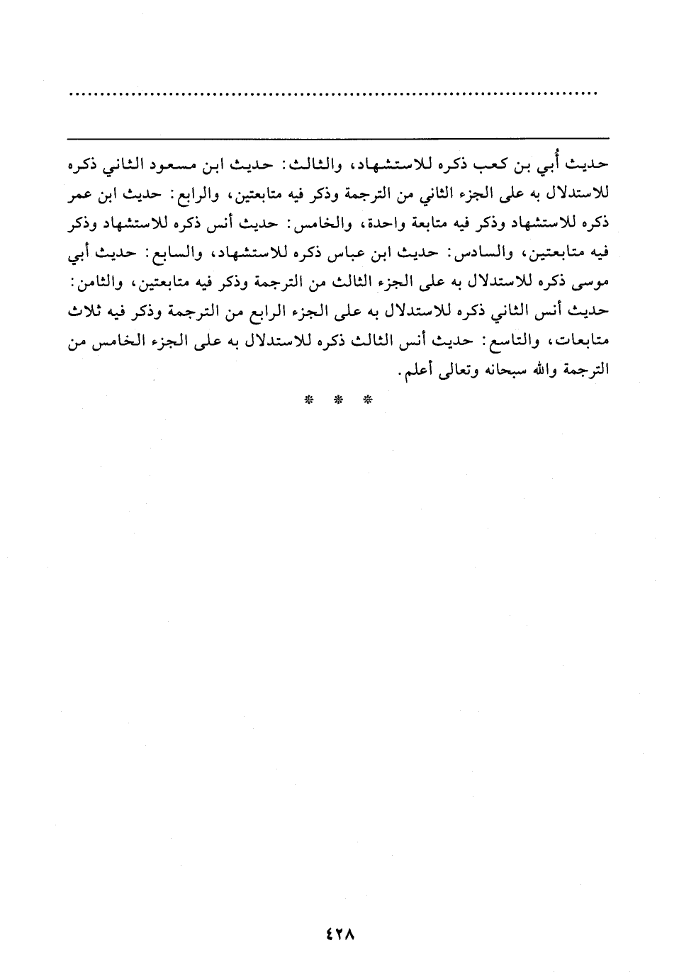 حديث أُبي بن كعب ذكره للاستشهاد، والثالث: حديث ابن مسعود الثاني ذكره للاستدلال به على الجزء الثاني من الترجمة وذكر فيه متابعتين، والرابع: حديث ابن عمر ذكره للاستشهاد وذكر فيه متابعة واحدة، والخامس: حديث أنس ذكره للاستشهاد وذكر فيه متابعتين، والسادس: حديث ابن عباس ذكره للاستشهاد، والسابع: حديث أبي موسى ذكره للاستدلال به على الجزء الثالث من الترجمة وذكر فيه متابعتين، والثامن: حديث أنس الثاني ذكره للاستدلال به على الجزء الرابع من الترجمة وذكر فيه ثلاث متابعات، والتاسع: حديث أنس الثالث ذكره للاستدلال به على الجزء الخامس من الترجمة والله سبحانه وتعالى أعلم.