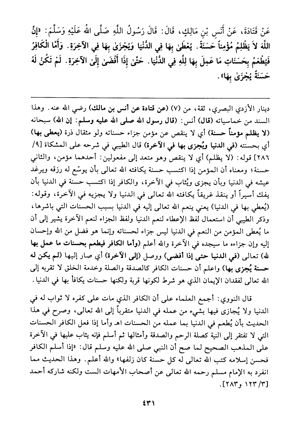 عَنْ قَتَادَةَ، عَنْ أَنَسِ بْنِ مَالِكٍ، قَالَ: قَالَ رَسُولُ اللَّهِ صَلَّى اللَّه عَلَيْهِ وَسَلمَ: "إِنْ اللَّهَ لَا يَظْلِمُ مُؤْمِنًا حَسَنَة. يُعْطَى بِهَا في الدُّنْيَا وَيُجْزَى بِهَا في الآخِرَةِ. وَأَمَّا الْكَافِرُ فَيُطْعَمُ بِحَسَنَاتِ مَا عَمِلَ بِهَا لِلَّهِ في الدُّنْيَا. حَتَّى إِذَا أَفْضَى إِلَى الآخِرَةِ. لَمْ تَكُنْ لَهُ حَسَنَةٌ يُجْزَى بِهَا"