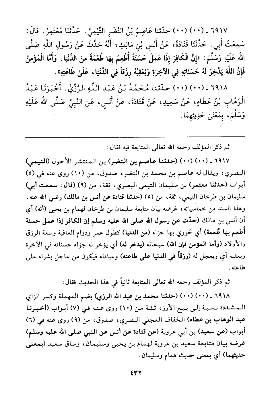 ٦٩١٨ - (٠٠) (٠٠) (حدثنا محمد بن عبد الله الرزي) بضم المهملة وكسر الزاي المشددة نسبة إلى بيع الأرز، ثقة من (١٠) روى عنه في (٧) أبواب (أخبرنا عبد الوهاب بن عطاء) الخفاف العجلي البصري، صدوق، من (٩) روى عنه في (٦) أبواب (عن سعيد) بن أبي عروبة (عن قتادة عن أنس عن النبي صلى الله عليه وسلم) غرضه بيان متابعة سعيد بن عروبة لهمام بن يحيى وسليمان، وساق سعيد (بمعنى حديثهما) أي بمعنى حديث همام وسليمان.