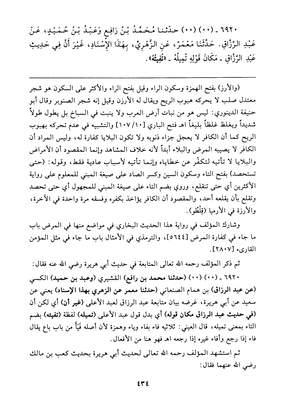 (والأرز) بفتح الهمزة وسكون الراء وقيل بفتح الراء والأكثر على السكون هو شجر معتدل صلب لا يحركه هبوب الريح ويقال له الأرزن وقيل إنه شجر الصنوبر وقال أبو حنيفة الدينوري: ليس هو من نبات أرض العرب ولا ينبت في السباخ بل يطول طولًا شديدًا ويغلظ غلظًا بليغًا اهـ فتح الباري [١٠/ ١٠٧] والتشبيه في عدم تحركه بهبوب الريح كما أن الكافر لا يعجل جزاء ذنوبه ولا تكون البلايا كفارة له، وليس المراد أن الكافر لا يصيبه المرض والبلاء أبدًا لأنه خلاف المشاهد وإنما المقصود أن الأمراض والبلايا لا تأتيه لتكفّر عن خطاياه وإنما تأتيه لأسباب عادية فقط، وقوله: (حتى تستحصد) بفتح التاء وسكون السين وكسر الصاد على صيغة المبني للمعلوم على رواية الأكثرين أي حتى تنقلع، وروي بضم التاء على صيغة المبني للمجهول أي حتى تحصد وتقلع بأن يقلعه أحد، والمقصود أن الكافر يؤاخذ بكفره وفسقه مرة واحدة في الآخرة، والأرزة في الأرميا (قِلْطُو).