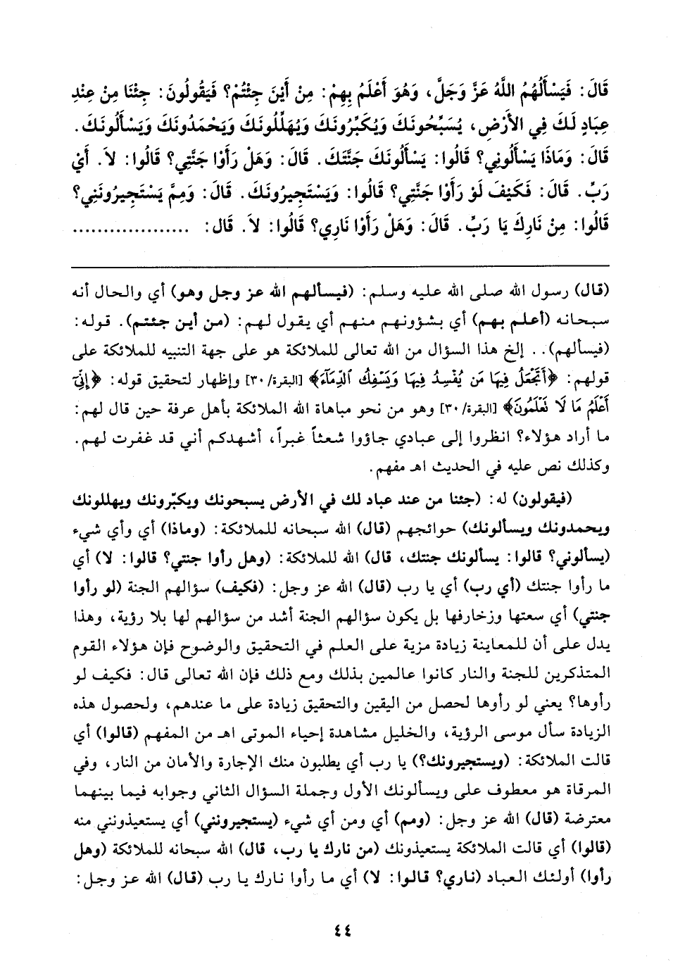 قَالَ: فَيَسْأَلُهُمُ اللهُ عَزَّ وَجَلَّ، وَهُوَ أَعْلَمُ بِهِمْ: مِنْ أَيْنَ جِئْتُمْ؟ فَيَقُولُونَ: جِئْنَا مِنْ عِنْدِ عِبَادٍ لَكَ فِي الأَرْضِ، يُسَبِّحُونَكَ وَيُكَبِّرُونَكَ وَيُهَلِّلونَكَ وَيَحْمَدُونَكَ وَيَسْأَلُونَكَ. قَالَ: وَمَاذَا يَسْأَلُونِي؟ قَالُوا: يَسْأَلُونَكَ جَنَّتَكَ. قَالَ: وَهَلْ رَأَوْا جَنَّتِي؟ قَالُوا: لَا. أَيْ رَبِّ. قَالَ: فَكَيْفَ لَوْ رَأَوْا جَنَّتِي؟ قَالُوا: وَيَسْتَجِيرُونَكَ. قَالَ: وَمِمَّ يَسْتَجِيرُونَنِي؟ قَالُوا: مِنْ نَارِكَ يَا رَبِّ. قَالَ: وَهَلْ رَأَوْا نَارِي؟ قَالُوا: لَا. قَال: