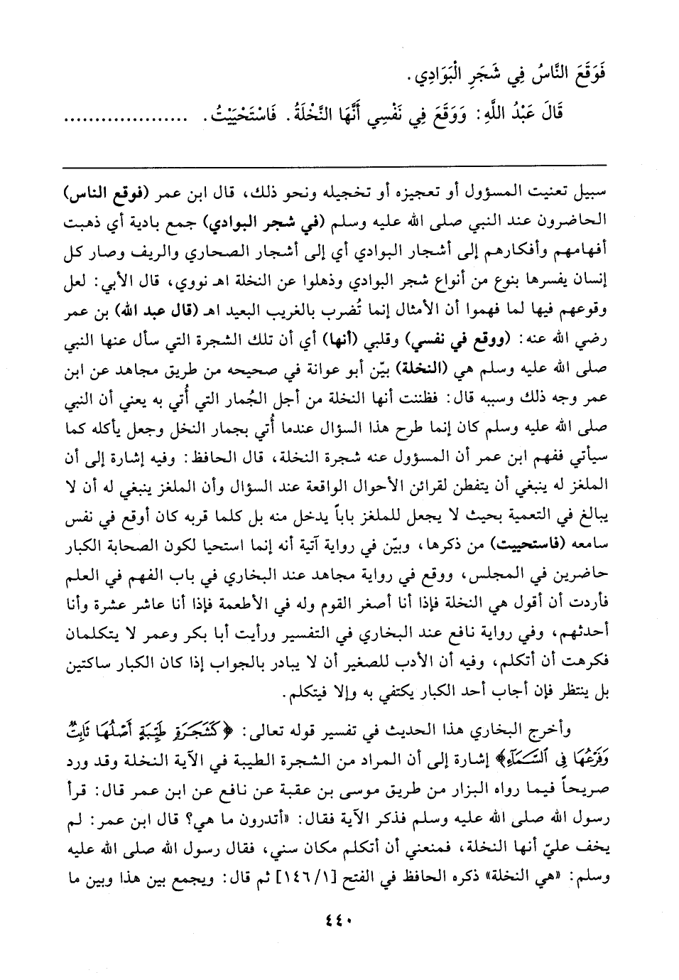 وأخرج البخاري هذا الحديث في تفسير قوله تعالى: {كَشَجَرَةٍ طَيِّبَةٍ أَصْلُهَا ثَابِتٌ وَفَرْعُهَا فِي السَّمَاءِ} إشارة إلى أن المراد من الشجرة الطيبة في الآية النخلة وقد ورد صريحًا فيما رواه البزار من طريق موسى بن عقبة عن نافع عن ابن عمر قال: قرأ رسول الله صلى الله عليه وسلم فذكر الآية فقال: "أتدرون ما هي؟ قال ابن عمر: لم يخف عليّ أنها النخلة، فمنعي أن أتكلم مكان سني، فقال رسول الله صلى الله عليه وسلم: "هي النخلة" ذكره الحافظ في الفتح [١/ ١٤٦] ثم قال: ويجمع بين هذا وبين ما