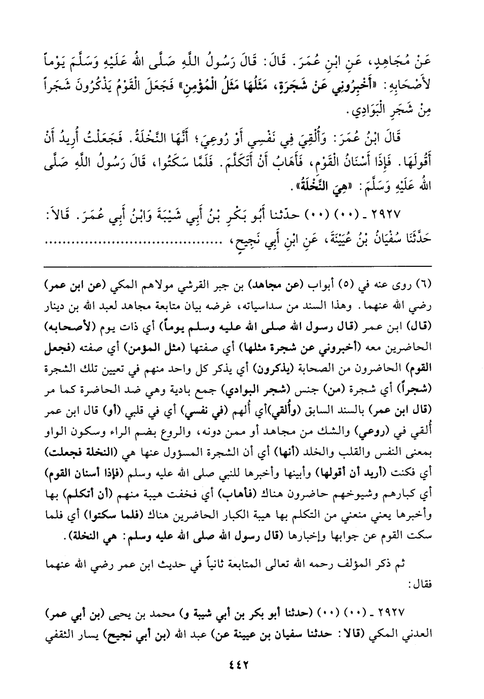 عَنْ مُجَاهِدٍ، عَنِ ابْنِ عُمَرَ. قَالَ: قَالَ رَسُولُ اللَّهِ صَلَّى اللَّه عَلَيْهِ وَسَلمَ يَوْمًا لأصحَابِهِ: "أَخْبِرُونِي عَنْ شَجَرَةٍ، مَثَلُهَا مَثَلُ الْمُؤْمِنِ" فَجَعَلَ الْقَوْمُ يَذْكُرُونَ شَجَرًا مِنْ شَجَرِ الْبَوَادِي.