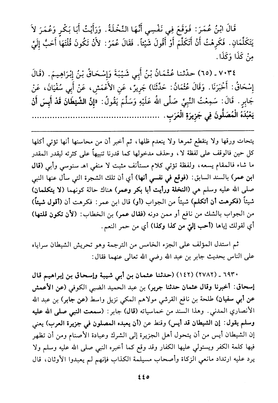 ٦٩٣٠ - (٢٧٨٢) (١٤٢) (حدثنا عثمان بن أبي شيبة وإسحاق بن إبراهيم قال إسحاق: أخبرنا وقال عثمان حدثنا جرير) بن عبد الحميد الضبي الكوفي (عن الأعمش عن أبي سفيان) طلحة بن نافع القرشي مولاهم المكي نزيل واسط (عن جابر) بن عبد الله الأنصاري المدني. وهذا السند من خماسياته (قال) جابر: (سمعت النبي صلى الله عليه وسلم يقول: إن الشيطان قد أيس) وقنط عن (أن يعبده المصلون في جزيرة العرب) يعني إن الشيطان أيس من أن يتحول أهل الجزيرة إلى الشرك وعبادة الأصنام ومن أن تظهر فيها كلمة الكفر ويستولي عليها الكفار وقد وقع كما أخبره النبي صلى الله عليه وسلم ولا يرد عليه ارتداد مانعي الزكاة وأصحاب مسيلمة الكذاب فإنهم لم يعبدوا الأوثان، قال