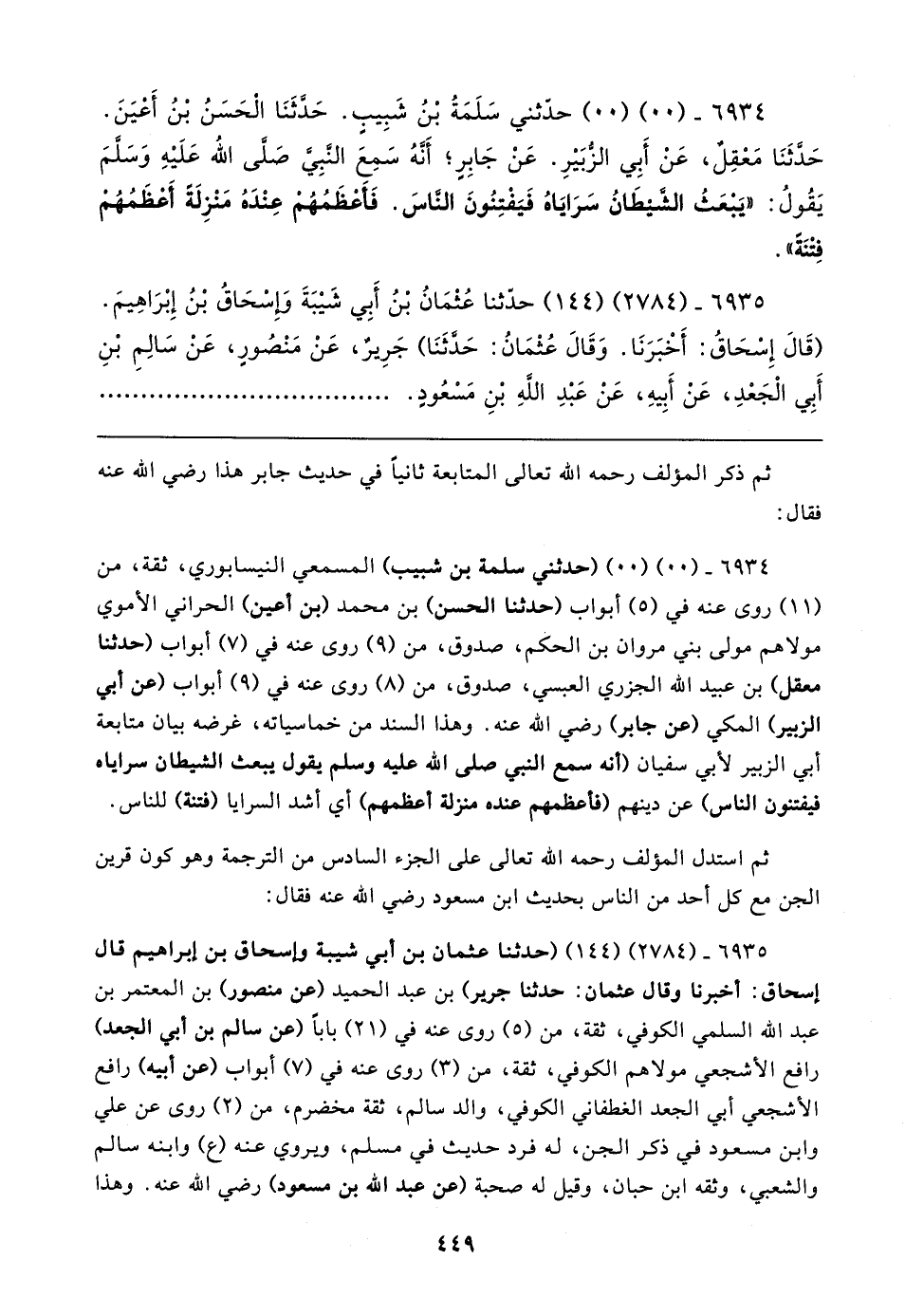 ٦٩٣٤ - (٠٠) (٠٠) (حدثني سلمة بن شبيب) المسمعي النيسابوري، ثقة، من (١١) روى عنه في (٥) أبواب (حدثنا الحسن) بن محمد (بن أعين) الحراني الأموي مولاهم مولى بني مروان بن الحكم، صدوق، من (٩) روى عنه في (٧) أبواب (حدثنا معقل) بن عبيد الله الجزري العبسي، صدوق، من (٨) روى عنه في (٩) أبواب (عن أبي الزبير) المكي (عن جابر) رضي الله عنه. وهذا السند من خماسياته، غرضه بيان متابعة أبي الزبير لأبي سفيان (أنه سمع النبي صلى الله عليه وسلم يقول يبعث الشيطان سراياه فيفتنون الناس) عن دينهم (فأعظمهم عنده منزلة أعظمهم) أي أشد السرايا (فتنة) للناس.