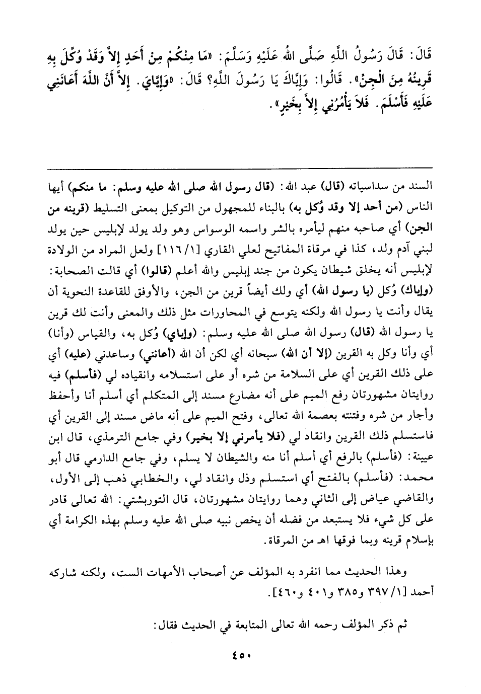 السند من سداسياته (قال) عبد الله: (قال رسول الله صلى الله عليه وسلم: ما منكم) أيها الناس (من أحد إلا وقد وُكل به) بالبناء للمجهول من التوكيل بمعنى التسليط (قرينه من الجن) أي صاحبه منهم ليأمره بالشر واسمه الوسواس وهو ولد يولد لإبليس حين يولد لبني آدم ولد، كذا في مرقاة المفاتيح لعلي القاري [١/ ١١٦] ولعل المراد من الولادة لإبليس أنه يخلق شيطان يكون من جند إبليس والله أعلم (قالوا) أي قالت الصحابة: (وإياك) وُكل (يا رسول الله) أي ولك أيضًا قرين من الجن، والأوفق للقاعدة النحوية أن يقال وأنت يا رسول الله ولكنه يتوسع في المحاورات مثل ذلك والمعنى وأنت لك قرين يا رسول الله (قال) رسول الله صلى الله عليه وسلم: (وإياي) وُكل به، والقياس (وأنا) أي وأنا وكل به القرين (إلا أن الله) سبحانه أي لكن أن الله (أعانني) وساعدني (عليه) أي على ذلك القرين أي على السلامة من شره أو على استسلامه وانقياده لي (فأسلم) فيه روايتان مشهورتان رفع الميم على أنه مضارع مسند إلى المتكلم أي أسلم أنا وأحفظ وأجار من شره وفتنته بعصمة الله تعالى، وفتح الميم على أنه ماض مسند إلى القرين أي فاستسلم ذلك القرين وانقاد لي (فلا يأمرني إلا بخير) وفي جامع الترمذي، قال ابن عيينة: (فأسلم) بالرفع أي أسلم أنا منه والشيطان لا يسلم، وفي جامع الدارمي قال أبو محمد: (فأسلم) بالفتح أي استسلم وذل وانقاد لي، والخطابي ذهب إلى الأول، والقاضي عياض إلى الثاني وهما روايتان مشهورتان، قال التوربشتي: الله تعالى قادر على كل شيء فلا يستبعد من فضله أن يخص نبيه صلى الله عليه وسلم بهذه الكرامة أي بإسلام قرينه وبما فوقها اه من المرقاة.