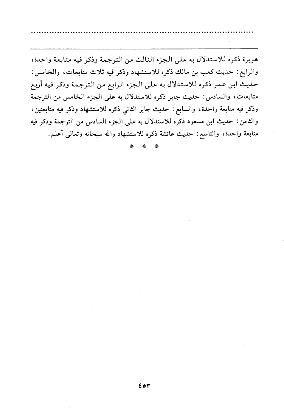 هريرة ذكره للاستدلال به على الجزء الثالث من الترجمة وذكر فيه متابعة واحدة، والرابع: حديث كعب بن مالك ذكره للاستشهاد وذكر فيه ثلاث متابعات، والخامس: حديث ابن عمر ذكره للاستدلال به على الجزء الرابع من الترجمة وذكر فيه أربع متابعات، والسادس: حديث جابر ذكره للاستدلال به على الجزء الخامس من الترجمة وذكر فيه متابعة واحدة، والسابع: حديث جابر الثاني ذكره للاستشهاد وذكر فيه متابعتين، والثامن: حديث ابن مسعود ذكره للاستدلال به على الجزء السادس من الترجمة وذكر فيه متابعة واحدة، والتاسع: حديث عائشة ذكره للاستشهاد والله سبحانه وتعالى أعلم.