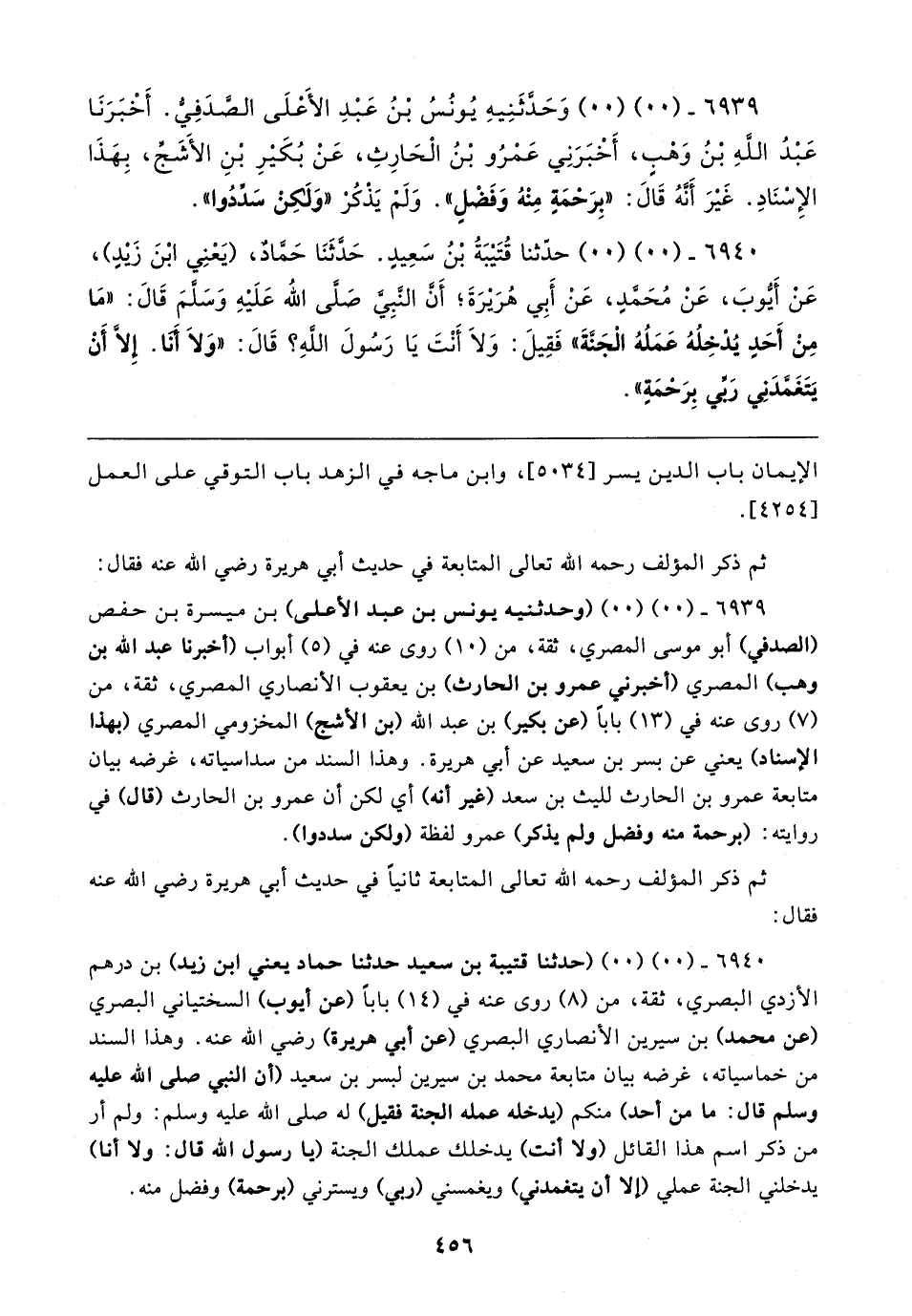 ٦٩٤٠ - (٠٠) (٠٠) (حدثنا قتيبة بن سعيد حدثنا حماد يعني ابن زيد) بن درهم الأزدي البصري، ثقة، من (٨) روى عنه في (١٤) بابًا (عن أيوب) السختياني البصري (عن محمد) بن سيرين الأنصاري البصري (عن أبي هريرة) رضي الله عنه. وهذا السند من خماسياته، غرضه بيان متابعة محمد بن سيرين لبسر بن سعيد (أن النبي صلى الله عليه وسلم قال: ما من أحد) منكم (يدخله عمله الجنة فقيل) له صلى الله عليه وسلم: ولم أر من ذكر اسم هذا القائل (ولا أنت) يدخلك عملك الجنة (يا رسول الله قال: ولا أنا) يدخلني الجنة عملي (إلا أن يتغمدني) ويغمسني (ربي) ويسترني (برحمة) وفضل منه.