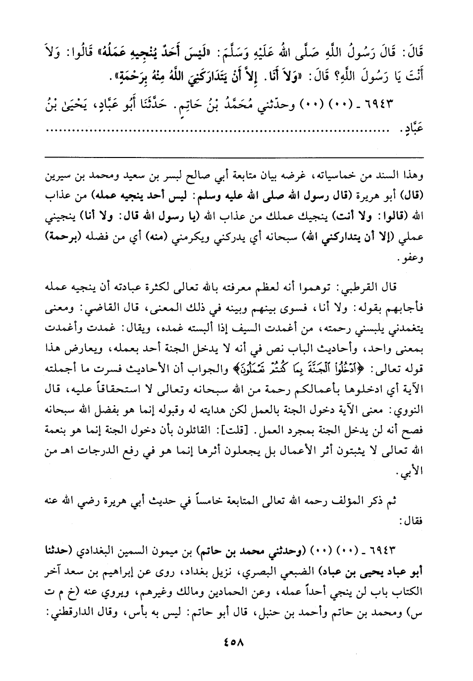 قَالَ: قَالَ رَسُولُ الله صَلَّى الله عَلَيْهِ وَسَلَّمَ: "لَيسَ أَحَد يُنْجِيهِ عَمَلُهُ" قَالُوا: وَلَا أَنْتَ يَا رَسُولَ اللهِ؟ قَالَ: "وَلَا أنا. إِلَّا أَنْ يَتَدَارَكَنيَ اللهُ مِنْهُ بِرَحْمَةٍ".