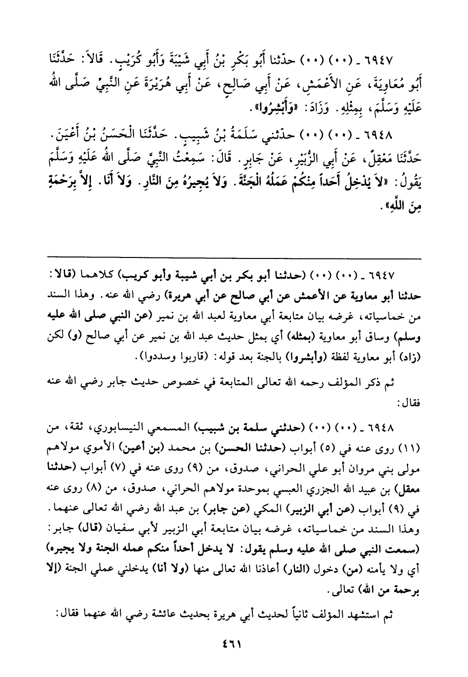 ٦٩٤٧ - (٠٠) (٠٠) (حدّثنا أبو بكر بن أبي شيبة وأبو كريب) كلاهما (قالا: حدّثنا أبو معاوية عن الأعمش عن أبي صالح عن أبي هريرة) رضي الله عنه. وهذا السند من خماسياته، غرضه بيان متابعة أبي معاوية لعبد الله بن نمير (عن النَّبيّ صَلَّى الله عليه وسلم) وساق أبو معاوية (بمثله) أي بمثل حديث عبد الله بن نمير عن أبي صالح (و) لكن (زاد) أبو معاوية لفظة (وأبشروا) بالجنة بعد قوله: (قاربوا وسددوا).