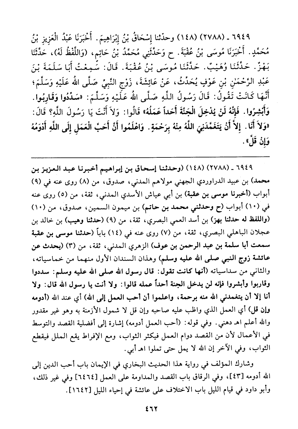٦٩٤٩ - (٢٧٨٨) (١٤٨) (وحدثنا إسحاق بن إبراهيم أخبرنا عبد العزيز بن محمَّد) بن عبيد الدراوردي الجهني مولاهم المدني، صدوق، من (٨) روى عنه في (٩) أبواب (أخبرنا موسى بن عقبة) بن أبي عياش الأسدي المدني، ثقة، من (٥) روى عنه في (١٠) أبواب (ح وحدثني محمَّد بن حاتم) بن ميمون السمين، صدوق، من (١٠) (واللفظ له حدّثنا بهز) بن أسد العمي البصري، ثقة، من (٩) (حدّثنا وهيب) بن خالد بن عجلان الباهلي البصري، ثقة، من (٧) روى عنه في (١٤) بابًا (حدّثنا موسى بن عقبة سمعت أبا سلمة بن عبد الرحمن بن عوف) الزُّهريّ المدني، ثقة، من (٣) (يحدث عن عائشة زوج النَّبيّ صَلَّى الله عليه وسلم) وهذان السندان الأوَّل منهما من خماسياته، والثَّاني من سداسياته (إنَّها كانت تقول: قال رسول الله صَلَّى الله عليه وسلم: سددوا وقاربوا وأبشروا فإنَّه لن يدخل الجنَّة أحدًا عمله قالوا: ولا أنت يا رسول الله قال: ولا أنا إلَّا أن يتغمدني الله منه برحمة، واعلموا أن أحب العمل إلى الله) أي عند الله (أدومه وإن قل) أي العمل الذي واظب عليه صاحبه وإن قل لا شمول الأزمنة به وهو غير مقدور والله أعلم اه دهني. وفي قوله: (أحب العمل أدومه) إشارة إلى أفضلية القصد والتوسط في الأعمال لأنَّ من القصد دوام العمل فيكثر الثواب، ومع الإفراط يقع الملل فيقطع الثواب، وفي الآخر إن الله لا يمل حتَّى تملوا اه أبي.
