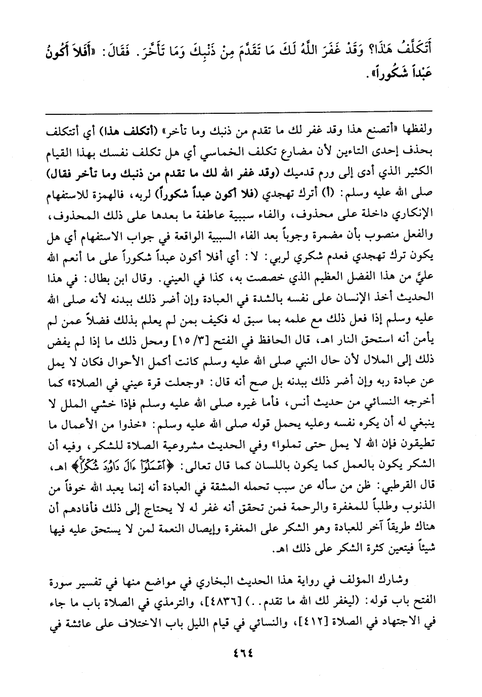 أَتَكَلَّفُ هَذَا؟ وَقَدْ غَفَرَ الله لَكَ مَا تَقَدمَ مِنْ ذَنبِكَ وَمَا تَأخَّرَ. فَقَالَ: "أَفَلَا أكُونُ عَبدًا شَكُورًا"