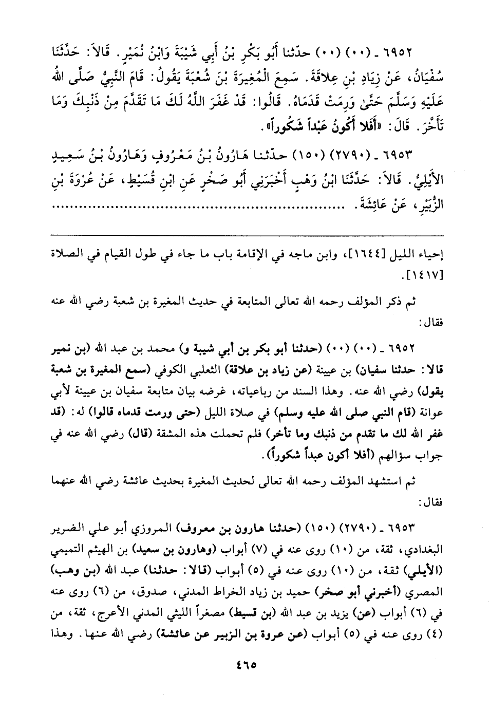 ٦٩٥٢ - (٠٠) (٠٠) حدّثنا أَبُو بَكرِ بْنُ أَبِي شَيْبَةَ وَابْنُ نُمَيْرٍ. قَالَا: حَدَّثَنَا سُفْيَانُ، عَنْ زَيادِ بْنِ عِلاقَةَ. سَمِعَ الْمُغِيرَةَ بْنَ شُعْبَةَ يَقُولُ: قَامَ النَّبِيُّ صَلَّى الله عَلَيْهِ وَسَلَّمَ حَتّى وَرِمَتْ قَدَمَاهُ. قَالُوا: قَد غَفَرَ الله لَكَ مَا تَقَدمَ مِنْ ذَنْبِكَ وَمَا تَأَخَرَ. قَالَ: "أَفَلا أَكُونُ عَبدًا شكُورًا".