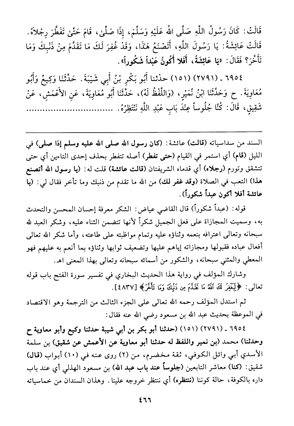 السند من سداسياته (قالت) عائشة: (كان رسول الله صلى الله عليه وسلم إذا صَلَّى) في الليل (قام) أي استمر في القيام (حتَّى تفطر) أصله تتفطر بحذف إحدى التاءين أي حتَّى تتشقق وتورم (رجلاه) أي قدماه الشريفتان (قالت عائشة) قلت له: (يا رسول الله أتصنع هذا) التعب في الصَّلاة (وقد غفر لك) من الله ما تقدم من ذنبك وما تأخر فقال لي: (يا عائشة أفلا أكون عبدًا شكورًا).