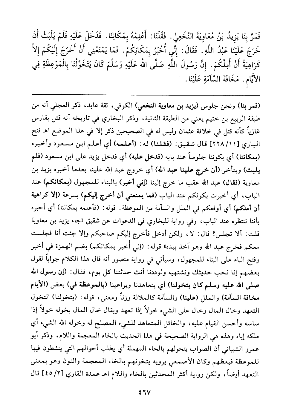 (فمر بنا) ونحن جلوس (يزيد بن معاوية النَّخعيُّ) الكوفيِّ، ثقة عابد، ذكر العجلي أنَّه من طبقة الرَّبيع بن خثيم يعني من الطبقة الثَّانية، وذكر البُخاريّ في تاريخه أنَّه قتل بفارس غازيًا كأنه قتل في خلافة عثمان وليس له في الصحيحين ذكر إلَّا في هذا الموضع أن فتح الباري [١١/ ٢٢٨] قال شقيق: (فقلنا) له: (أعلمه) أي أعلم ابن مسعود وأخبره (بمكاننا) أي بكوننا جلوسًا عند بابه (فدخل عليه) أي فدخل يزيد على ابن مسعود (فلم يلبث) ويتأخر (أن خرج علينا عبد الله) أي خروج عبد الله علينا بعدما أخبره يزيد بن معاوية (فقال) عبد الله عقب ما خرج إلينا (إنِّي أخبر) بالبناء للمجهول (بمكانكم) عند الباب، أي أخبرت بكونكم عند الباب (فما يمنعني أن أخرج إليكم) بسرعة (إلَّا كراهية أن أملكم) أي أوقعكم في الملل والسآمة من الموعظة. قوله: (فأعلمه بمكاننا) أي أخبره بأننا ننتظره عند الباب، وفي رواية للبخاري في الدعوات عن شقيق "جاء يزيد بن معاوية قلت: ألا تجلس؟ قال: لا، ولكن أدخل فأخرج إليكم صاحبكم وإلا جئت أنا فجلست معكم فخرج عبد الله وهو آخذ بيده" قوله: (إنِّي أُخبر بمكانكم) بضم الهمزة في أخبر وفتح الباء على البناء للمجهول؛ وسيأتي في رواية منصور أنَّه قال هذا الكلام جوابًا لقول بعضهم إنا نحب حديثك ونشتهيه ولوددنا أنك حدثتنا كل يوم، فقال: (إن رسول الله صَلَّى الله عليه وسلم كان يتخولنا) أي يتعاهدنا ويراعينا (بالموعظة في) بعض (الأيَّام مخافة السآمة) والملل (علينا) والسآمة كالملالة وزنًا ومعنى، قوله: (يتخولنا) التخول التعهد وخال المال وخال على الشيء خولًا إذا تعهد ويقال خال المال يخوله خولًا إذا ساسه وأحسن القيام عليه، والخائل المتعاهد للشيء المصلح له وخوله الله الشيء أي ملكه إياه وهذه هي الرّواية الصحيحة في هذا الحديث بالخاء المعجمة واللام، وذكر أبو عمرو الشيباني أن الصواب يتحولهم بالحاء المهملة أي يطلب أحوالهم التي ينشطون فيها للموعظة فيعظهم وكان الأصمعي يرويه يتخونهم بالخاء المعجمة والنون وهو بمعنى التعهد أيضًا، ولكن رواية أكثر المحدثين بالخاء واللام اه عمدة القارئ [٢/ ٤٥] قال