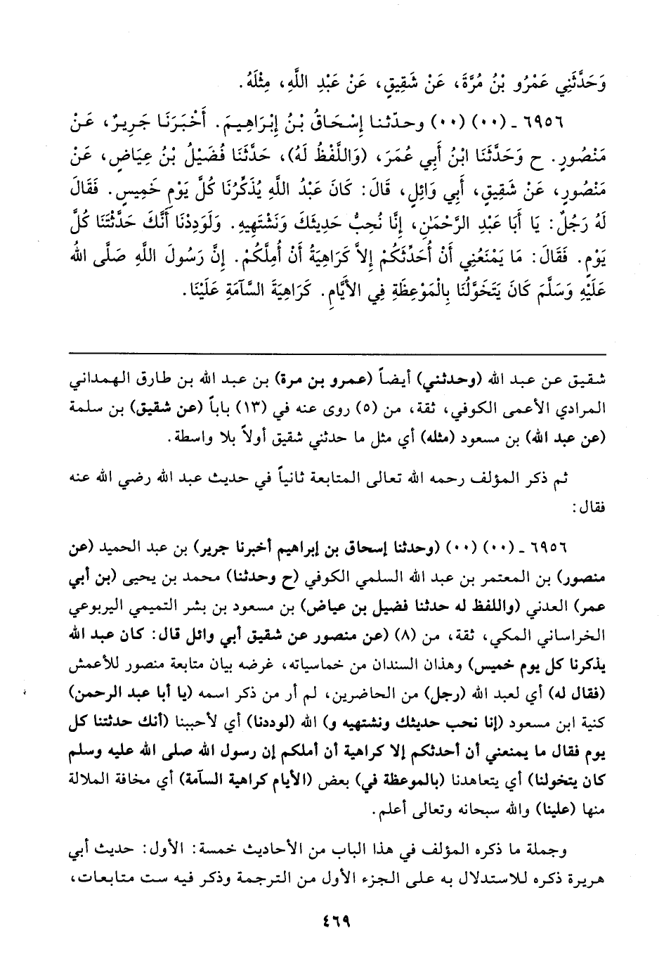 ٦٩٥٦ - (٠٠) (٠٠) وحدّثنا إِسْحَاقُ بْنُ إِبْرَاهِيمَ. أَخْبَرَنَا جَرِيرٌ، عَنْ مَنْصُورٍ. ح وَحَدَّثَنَا ابْنُ أَبِي عُمَرَ، (وَاللَّفْظُ لَهُ)، حَدَّثَنَا فُضَيْلُ بْنُ عِيَاضٍ، عَنْ مَنْصُورٍ، عَنْ شَقيقٍ، أَبِي وَائِلٍ، قَالَ: كَانَ عَبْدُ الله يُذَكِّرُنَا كُل يَوْم خَمِيسٍ. فَقَالَ لَهُ رَجُلٌ: يَا أَبَا عَبْدِ الرَّحْمَنِ، إِنا نُحِبُّ حَدِيثَكَ وَنَشْتَهِيهِ. وَلَوَدِدْنَا أَنَّكَ حَدَّثْتَنَا كُلَّ يَوْمٍ. فَقَالَ: مَا يَمْنَعُنِي أَنْ أُحَدِّثَكُمْ إِلَّا كَرَاهِيَةُ أَن أُمِلَّكُمْ. إِنَّ رَسُولَ الله صَلَّى الله عَلَيْهِ وَسَلَّمَ كَانَ يَتَخَوَّلُنَا بِالْمَوْعِظَةِ فِي الأَيَّامِ. كَرَاهِيَةَ السَّآمَةِ عَلَيْنَا