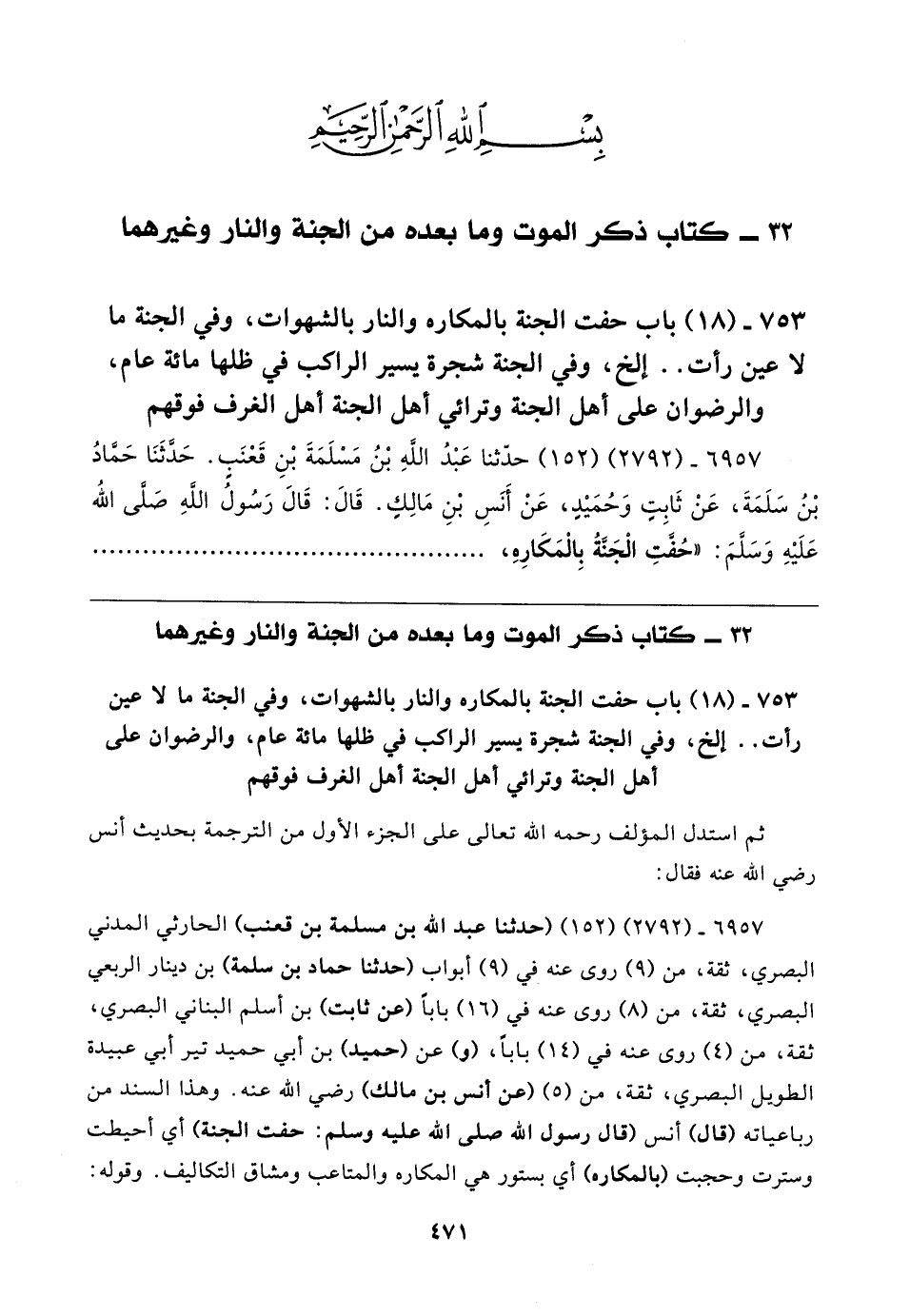 ٦٩٥٧ - (٢٧٩٢) (١٥٢) (حدّثنا عبد الله بن مسلمة بن قعنب) الحارثي المدني البصري، ثقة، من (٩) روى عنه في (٩) أبواب (حدّثنا حماد بن سلمة) بن دينار الربعي البصري، ثقة، من (٨) روى عنه في (١٦) بابًا (عن ثابت) بن أسلم البناني البصري، ثقة، من (٤) روى عنه في (١٤) بابًا، (و) عن (حميد) بن أبي حميد تير أبي عبيدة الطَّويل البصري، ثقة، من (٥) (عن أنس بن مالك) رضي الله عنه. وهذا السند من رباعياته (قال) أنس (قال رسول الله صلى الله عليه وسلم: حفت الجنَّة) أي أحيطت وسترت وحجبت (بالمكاره) أي بستور هي المكاره والمتاعب ومشاق التكاليف. وقوله: