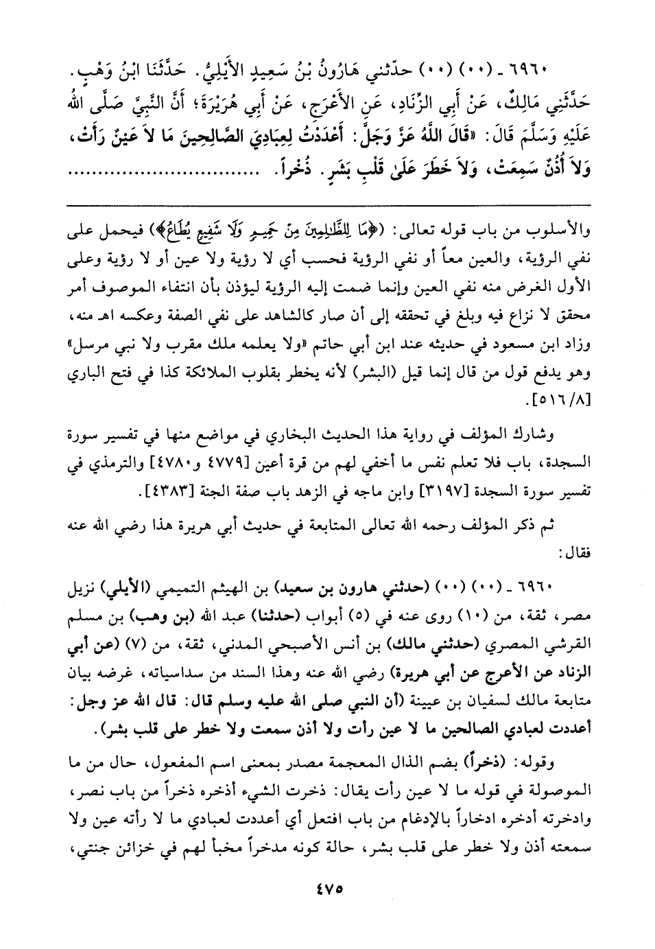 ٦٩٦٠ - (٠٠) (٠٠) (حدثني هارون بن سعيد) بن الهيثم التميمي (الأيلي) نزيل مصر، ثقة، من (١٠) روى عنه في (٥) أبواب (حدّثنا) عبد الله (بن وهب) بن مسلم القرشي المصري (حدثني مالك) بن أنس الأصبحي المدني، ثقة، من (٧) (عن أبي الزناد عن الأعرج عن أبي هريرة) رضي الله عنه وهذا السند من سداسياته، غرضه بيان متابعة مالك لسفيان بن عيينة (أن النَّبيّ صَلَّى الله عليه وسلم قال: قال الله عزَّ وجل: أعددت لعبادي الصَّالحين ما لا عين رأت ولا أذن سمعت ولا خطر على قلب بشر).