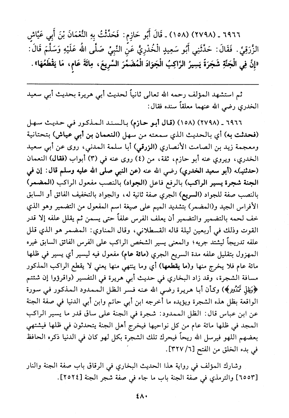 ٦٩٦٦ - (٢٧٩٨) (١٥٨) - قَالَ أَبُو حَازِمٍ: فَحَدَّثتُ بِهِ النُّعْمَانَ بْنَ أَبِي عَيَّاشٍ الزُّرَقِيَّ. فَقَالَ: حَدَّثَنِي أَبُو سَعِيدِ الْخُدْرِيِّ عَنِ النَّبِى صَلَّى الله عَلَيْهِ وَسَلَّمَ قَالَ: "إِن فِي الجَنَّةِ شجَرَةَ يَسِيرُ الرَّاكِبُ الْجَوَادَ الْمُضَمَّرَ السَّرِيعَ، مِائَةَ عَامٍ، مَا يَقْطَعُهَا"