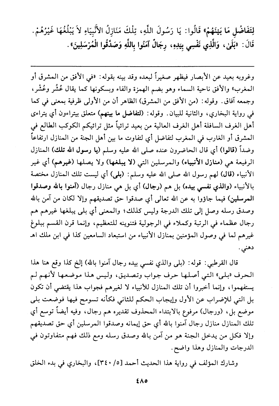 لِتَفَاضُلِ مَا بَينَهُمْ" قَالُوا: يَا رَسُولَ الله، تِلْكَ مَنَازِلُ الأَنْبِيَاءِ لَا يَبْلُغُهَا غَيْرُهُمْ. قَالَ: "بَلَى، وَالَّذِي نَفْسِي بِيَدِهِ، رِجَالٌ آمَنُوا بِاللهِ وَصَدَّقُوا الْمُرْسَلِينَ"