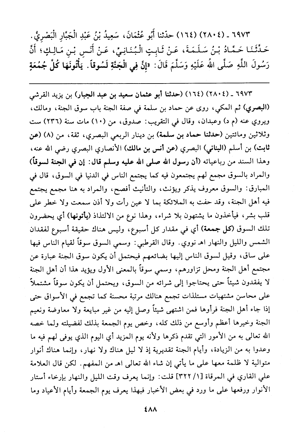 ٦٩٧٣ - (٢٨٠٤) (١٦٤) حدّثنا أَبُو عُثْمَانَ، سَعِيدُ بْنُ عَبْدِ الْجَبَّارِ الْبَصْرِيُّ. حَدَّثَنَا حَمَّادُ بْنُ سَلَمَةَ، عَنْ ثَابِتٍ الْبُنَانِيِّ، عَنْ أَنَسِ بْنِ مَالِكٍ؛ أَنَّ رَسُولَ اللهِ صَلَّى الله عَلَيْهِ وَسَلَّمَ قَالَ: "إِنَّ فِي الْجَنَّةِ لَسُوقًا. يَأتونَهَا كُلَّ جُمُعَةٍ