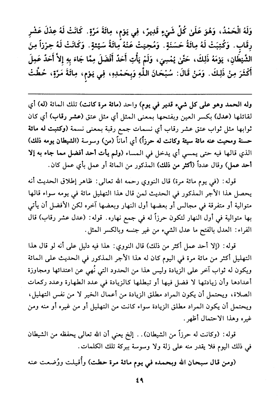 وَلَهُ الْحَمْدُ، وَهُوَ عَلَى كُلِّ شَيْءٍ قَدِيرٌ، فِي يَوْمٍ، مِائَةَ مَرَّةٍ. كَانَتْ لَهُ عِدْلَ عَشْرِ رِقَابٍ. وَكُتِبَتْ لَهُ مِائَةُ حَسَنَةٍ. وَمُحِيَتْ عَنْهُ مِائَةُ سَيِّئْةٍ. وَكَانَتْ لَهُ حِرْزًا مِنَ الشَّيْطَانِ، يَوْمَهُ ذَلِكَ، حَتَّى يُمْسِيَ، وَلَمْ يَأتِ أَحَدٌ أَفْضَلَ مِمَّا جَاءَ بِهِ إِلَّا أَحَدٌ عَمِلَ أَكْثَرَ مِنْ ذَلِكَ. وَمَنْ قَالَ: سُبْحَانَ اللهِ وَبِحَمْدِهِ، فِي يَوْمٍ، مِائَةَ مَرَّةٍ، حُطَّتْ