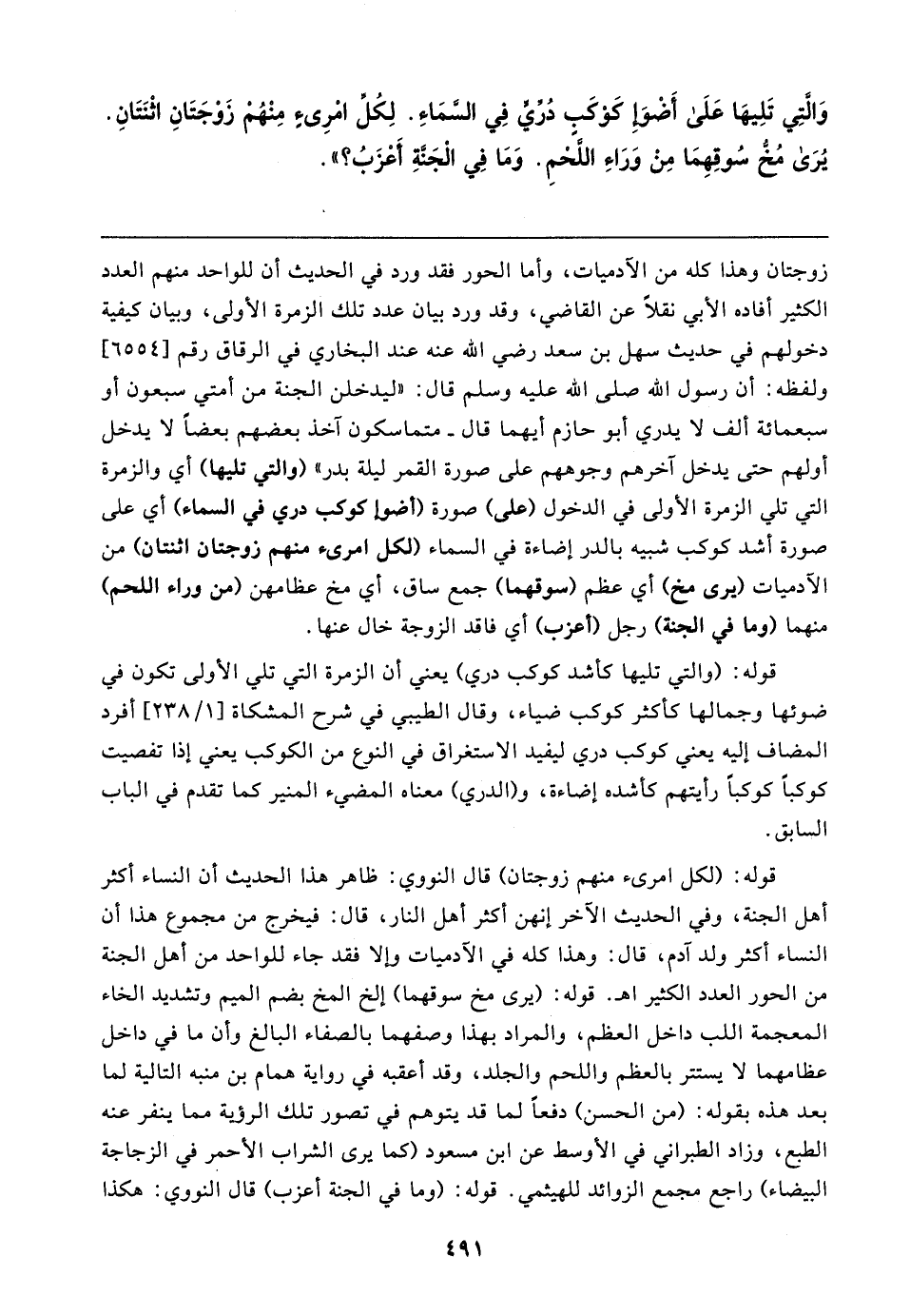 زوجتان وهذا كله من الآدميات، وأمَّا الحور فقد ورد في الحديث أن للواحد منهم العدد الكثير أفاده الأبي نقلًا عن القاضي، وقد ورد بيان عدد تلك الزمرة الأولى، وبيان كيفية دخولهم في حديث سهل بن سعد رضي الله عنه عند البُخاريّ في الرقاق رقم [٦٥٥٤] ولفظه: أن رسول الله صَلَّى الله عليه وسلم قال: "ليدخلن الجنَّة من أمتي سبعون أو سبعمائة ألف لا يدري أبو حازم أيهما قال - متماسكون آخذ بعضهم بعضًا لا يدخل أولهم حتَّى يدخل آخرهم وجوههم على صورة القمر ليلة بدر" (والتي تليها) أي والزمرة التي تلي الزمرة الأولى في الدخول (على) صورة (أضوإ كوكب دري في السماء) أي على صورة أشد كوكب شبيه بالدر إضاءة في السماء (لكل امرئ منهم زوجتان اثنتان) من الآدميات (يرى مخ) أي عظم (سوقهما) جمع ساق؛ أي منع عظامهن (من وراء اللحم) منهما (وما في الجنَّة) رجل (أعزب) أي فاقد الزوجة خال عنها.